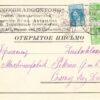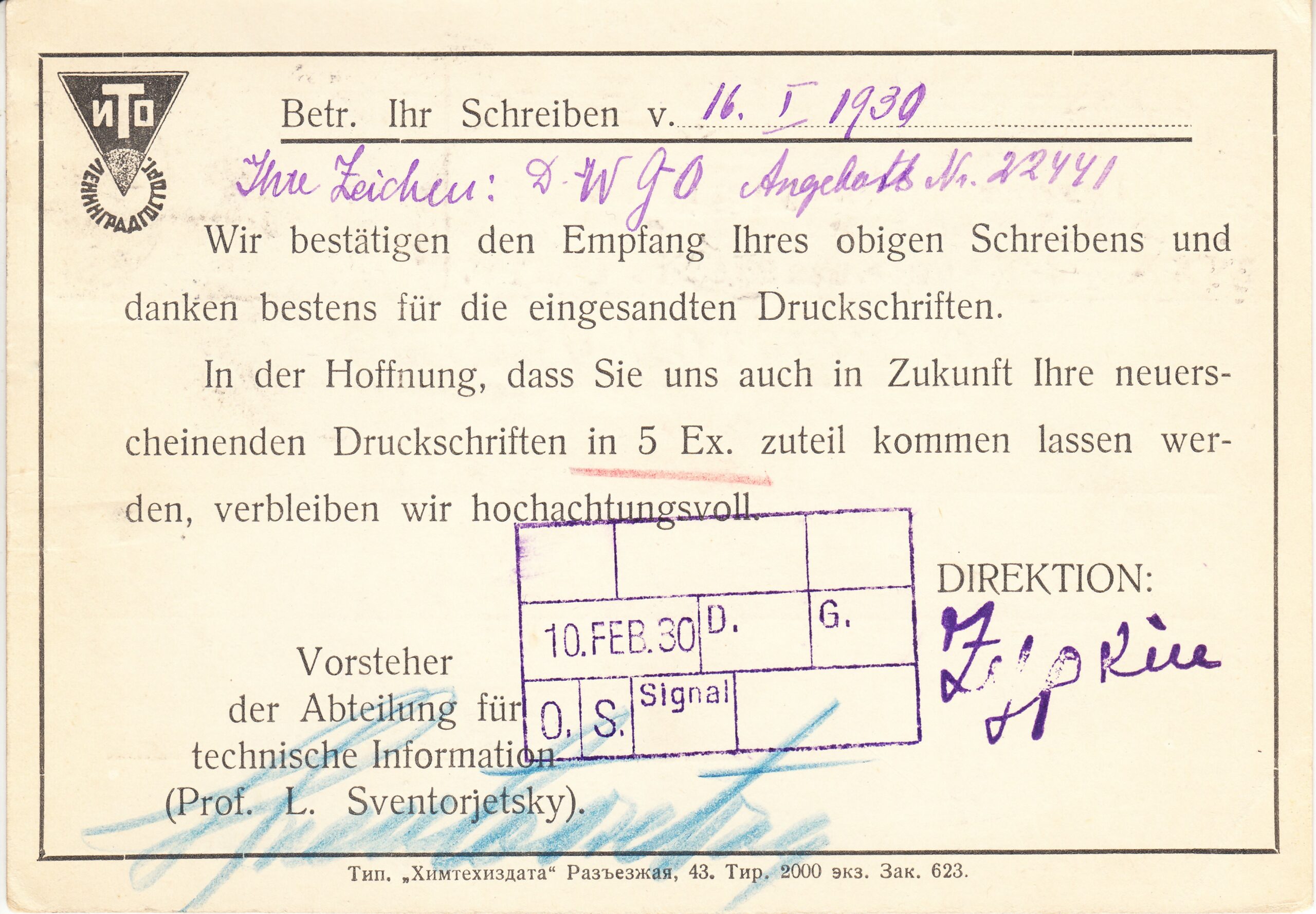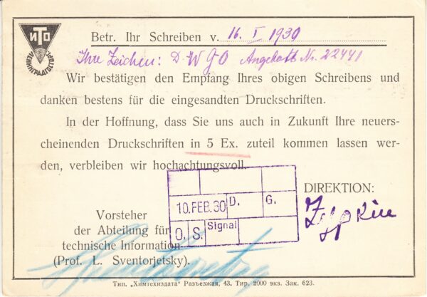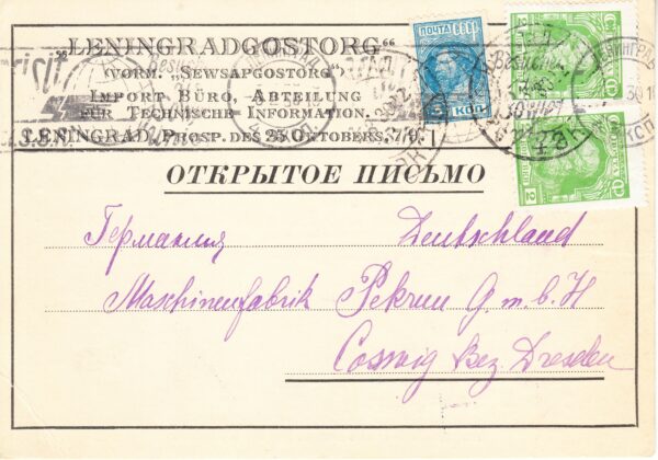 Открытое письмо, прошедшее почту из Ленинграда в Косвиг (Германия) от 06.02.1930 года. Письмо франкировано 3-мя маркам:и 2 коп. № 258 две марки и 3 коп. № 295 одна марка.
