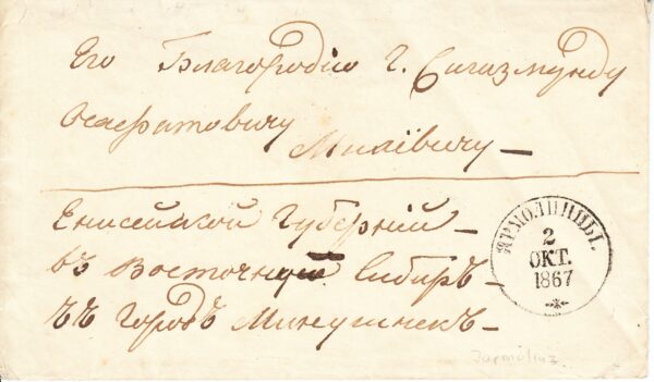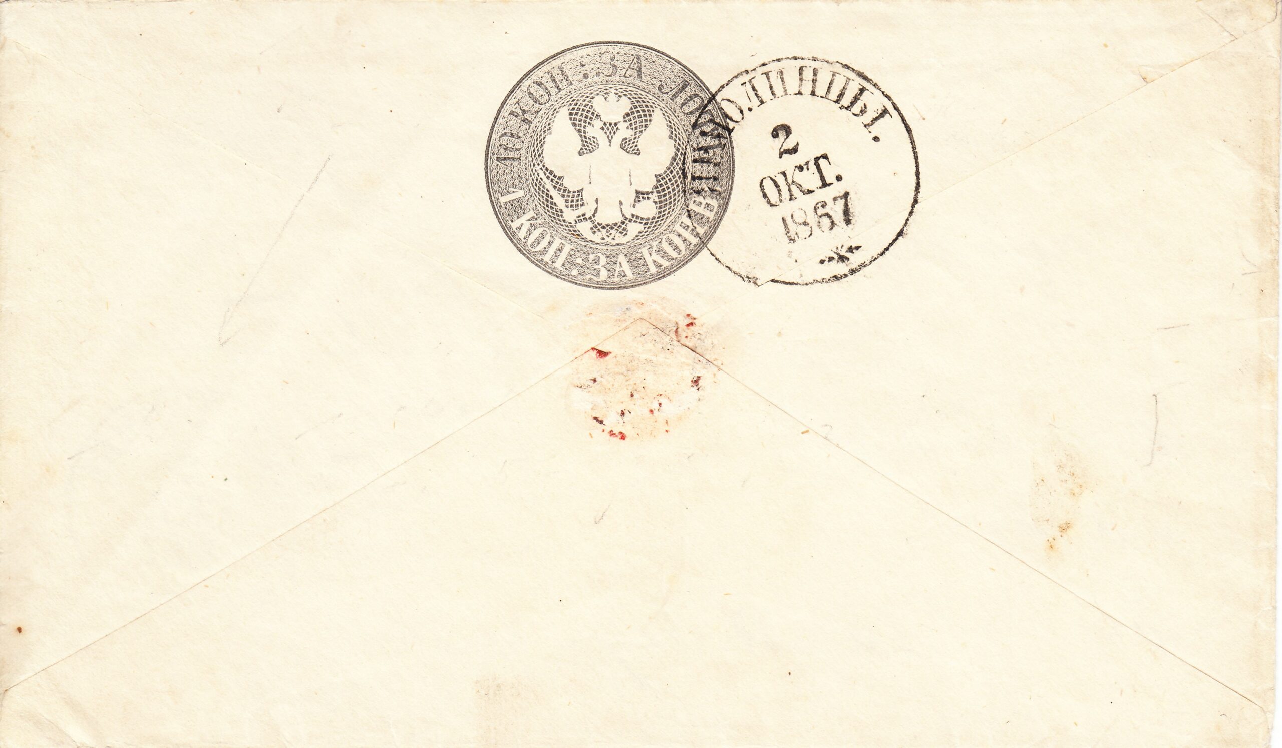 Штемпельный Конверт. Шестой выпуск № 14С (140х84). Письмо отправлено из Ярмолицы в Минусинск от 02.10.1867 г. Цена по каталогу Крамаренко 2022 года $100.