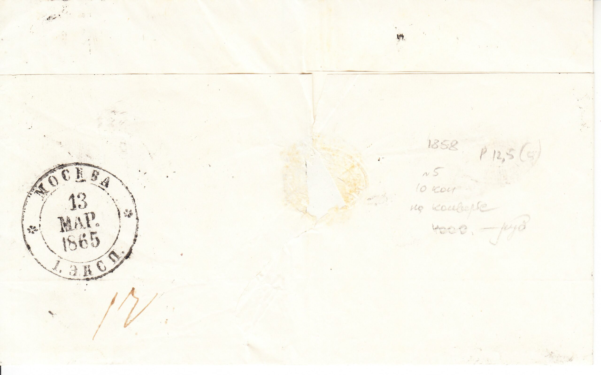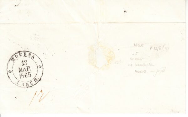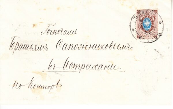 Письмо отправлено из Москвы в Астрахань братьям Сапожниковым от 13.03.1865 г. Братья (Алексей и Александр) являлись крупнейшими астраханскими промышлениками, владельцами известной, богатейшей торговой и рыбопромышленной фирмы, открытой в 1819 году. Конверт франкирован маркой 10 коп. № 5. Цена по каталогу Крамаренко 2022 года $250.