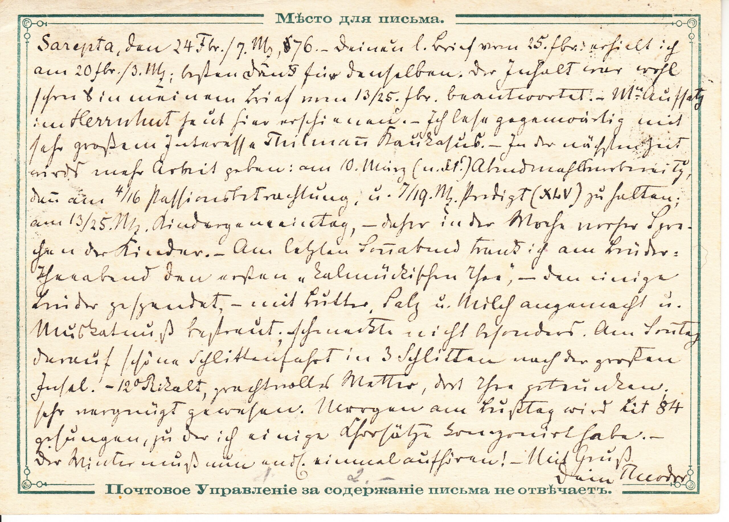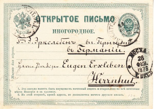 Маркированное открытое письмо иногородное, прошедшее почту. Второй выпуск № 3. Письмо было отправлено из Сарептское (Саратовская губ.) в Хернхут (Германия) через Москву от 24.02.1876 г. Цена по каталогу Крамаренко 2022 года $45.