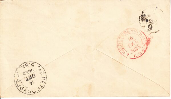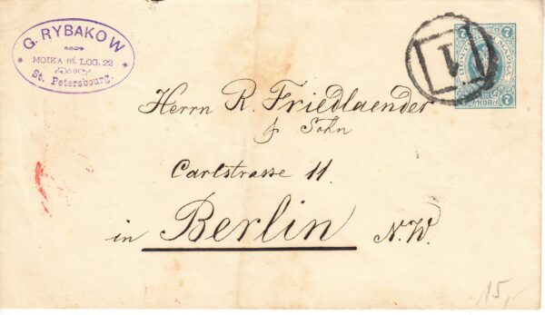 Маркированный конверт, прошедший почту. Пятнадцатый выпуск № 40С (143х81). Письмо было отправлено из С.Петербурга в Берлин от 14.10.1885 г. В левом верхнем углу личный штамп отправителя. Цена по каталогу Крамаренко 2022 года $150.
