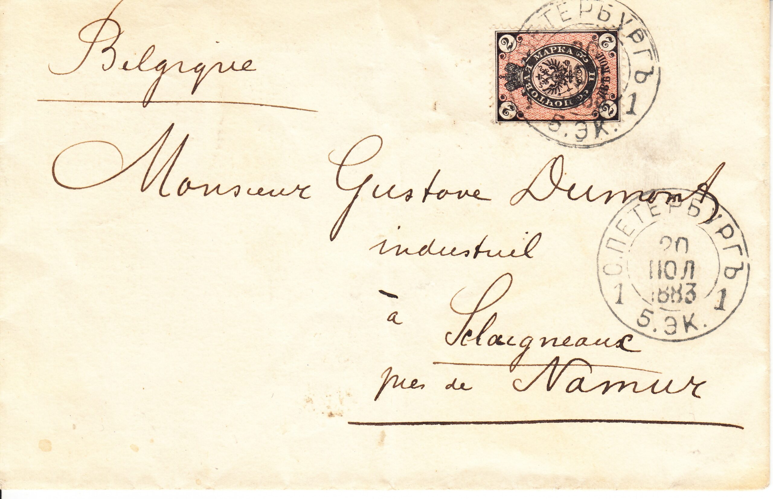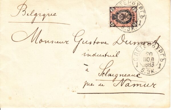 Почтовое отправление из Санкт-Петербурга в Намюр (Бельгия) от 20.07.1883 г. Конверт франкирован маркой 2 коп. № 29, (горизонтальное верже). Цена по каталогу Крамаренко 2022 года $350.