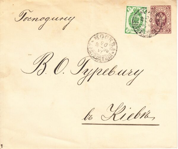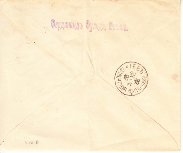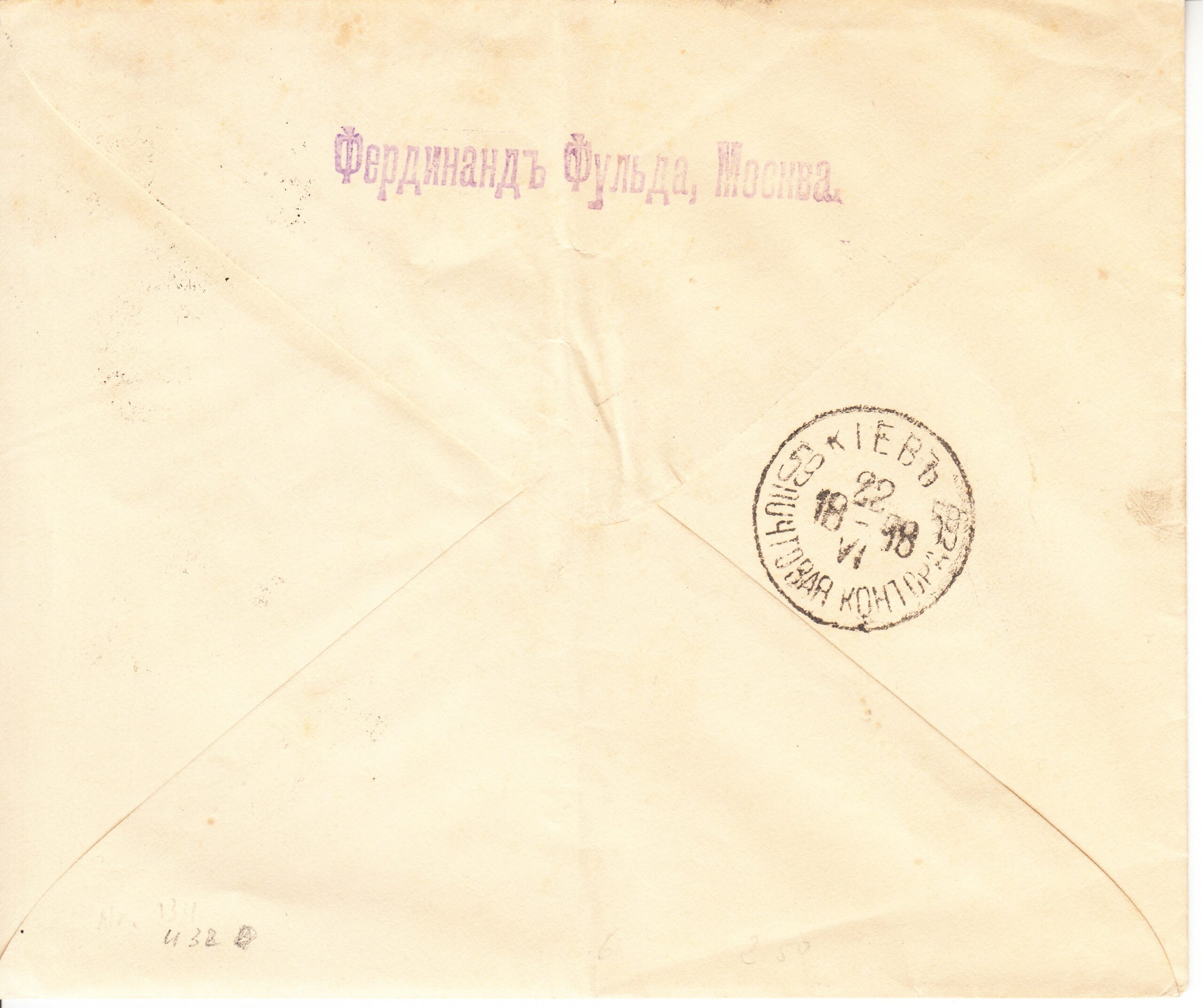 Маркированный конверт, прошедший почту. Шестнадцатый выпуск № 42А (144х120). Письмо дополнительно франкировано маркой 2 коп. № 62 и было отправлено из Москвы в Киев от 20.06.1898 г. На обратной стороне личный штамп отправителя. Фульда Фердинанд Леонтьевич — гессен-дарштатский подданый, купец и основатель известной фирмы химических и москательных товаров. Цена по каталогу Крамаренко 2022 года $60.