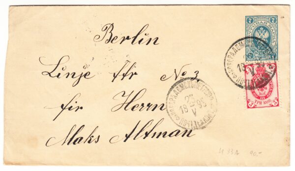Маркированный конверт, прошедший почту. Шестнадцатый выпуск № 43С (143х81). Письмо дополнительно франкировано маркой 3 коп. №72 и было отправлено из Новорадомска в Берлин от 23.05.1895 г. Цена по каталогу Крамаренко 2022 года $40.