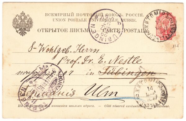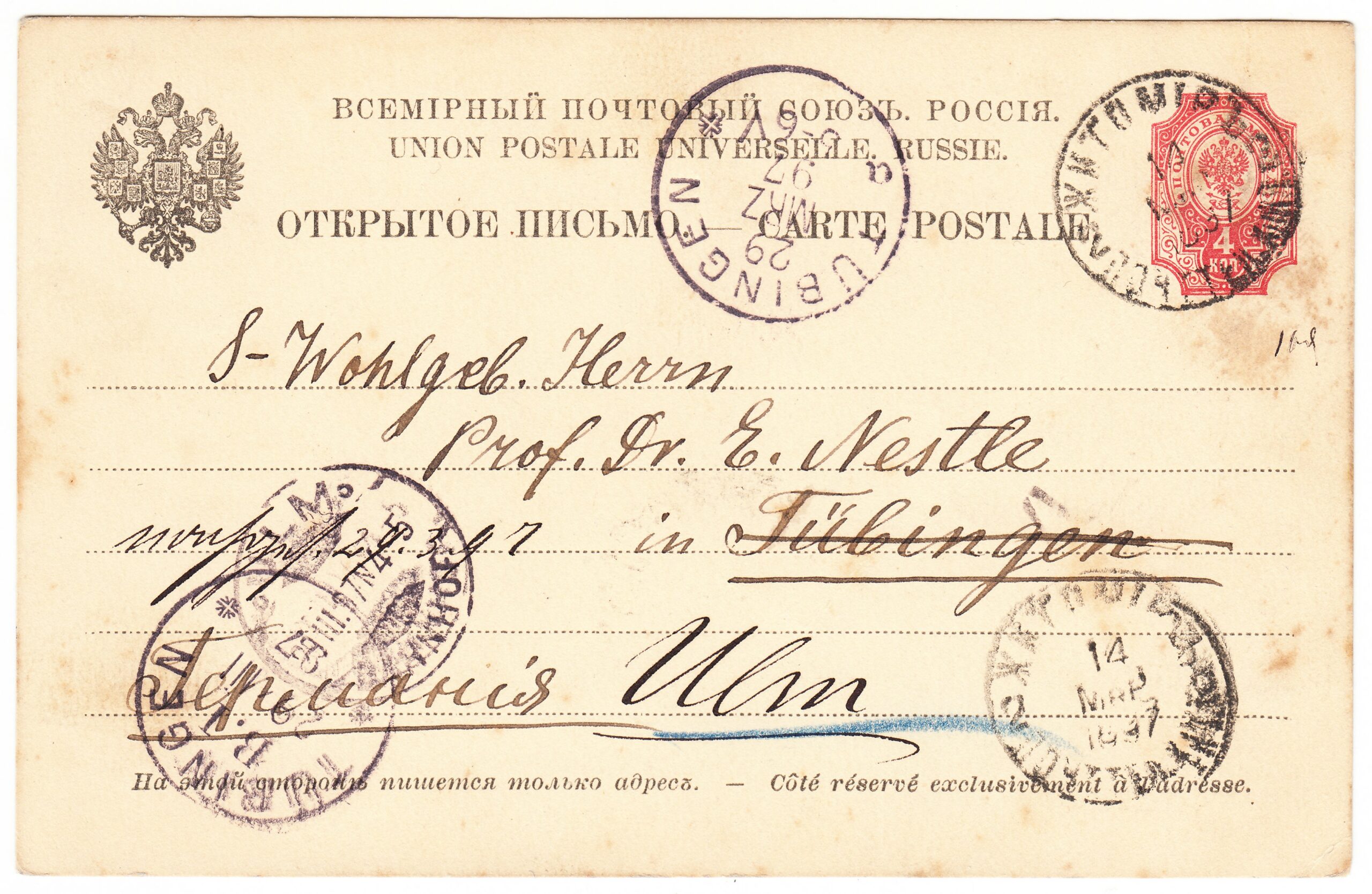 Открытое письмо, прошедшее почту из Житомира в Тубинген (Германия) от 14.03.1897 г. Шестой выпуск № 10. Цена по каталогу Крамаренко 2022 года $15.