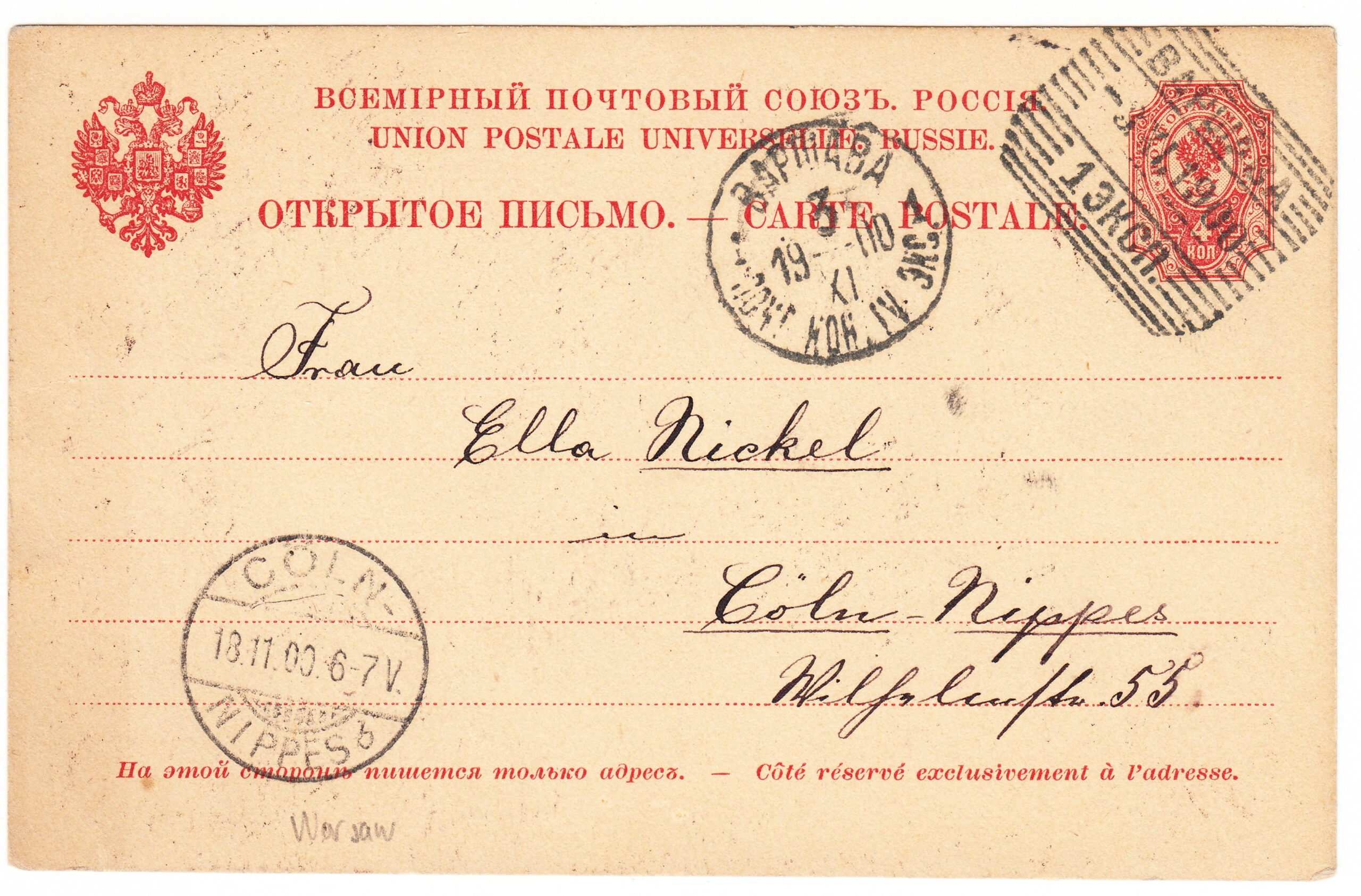 Открытое письмо седьмого выпуска № 14, прошедшее почту из Варшавы в Кёльн от 03.11.1900 г. Цена по каталогу Крамаренко 2022 года $15.