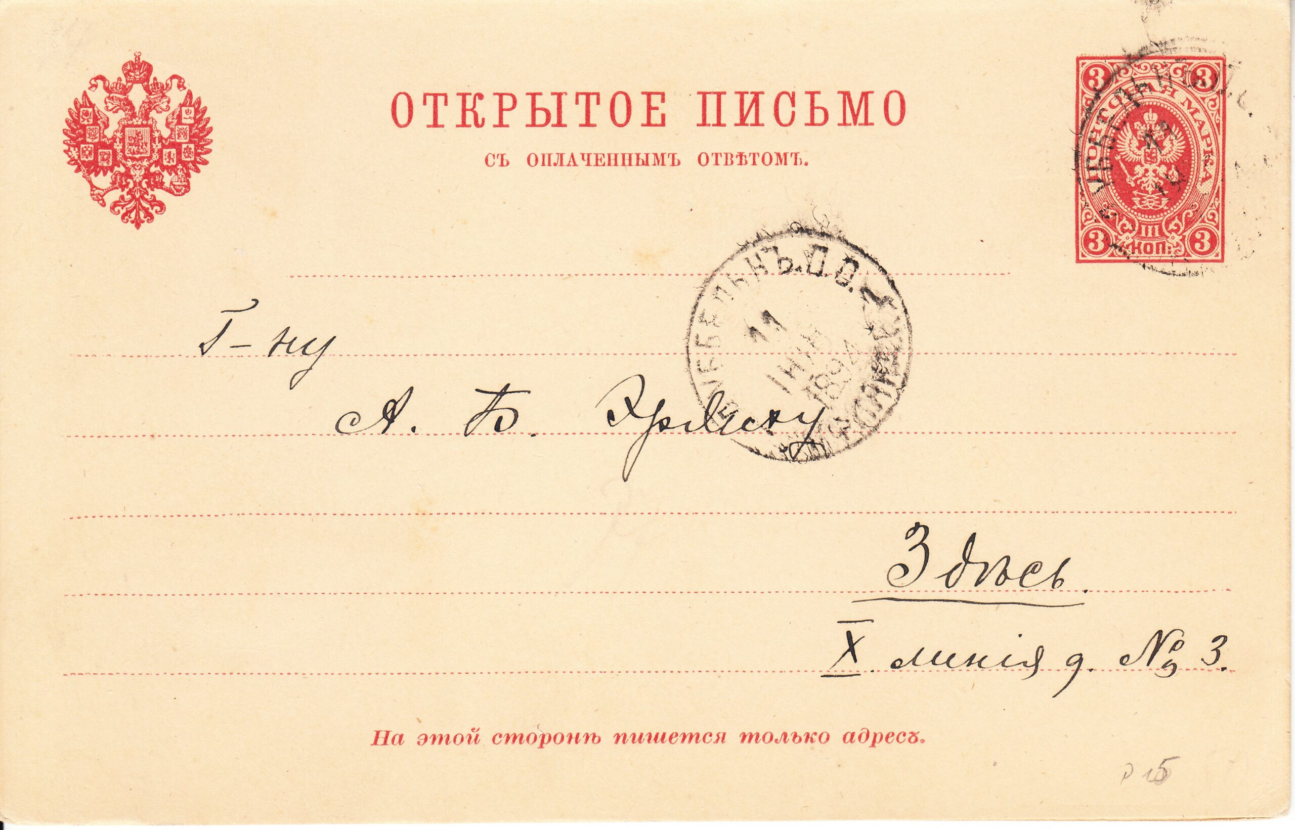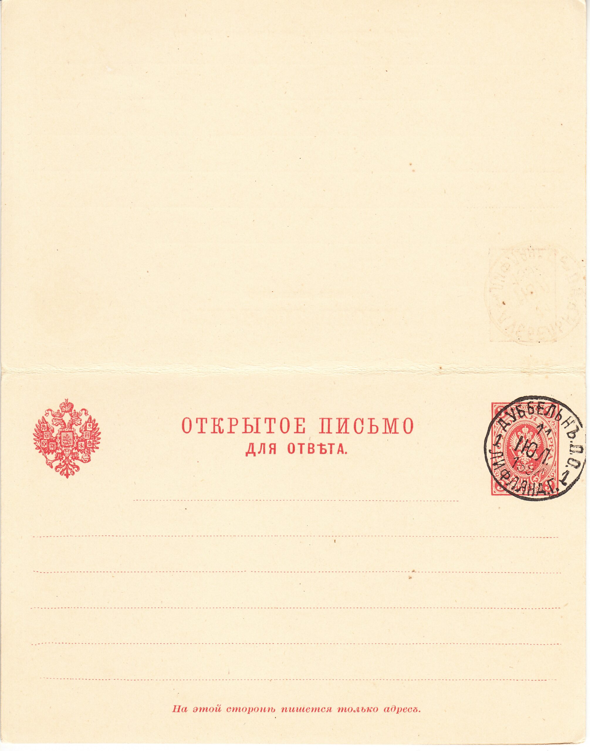 Маркированное открытое письмо № 13, с оплаченным ответом, отправлено в Дуббельн (Лифляндская губ.) как местное от 11.07.1894 г. Цена по каталогу Крамаренко 2022 года $35.