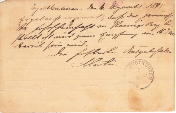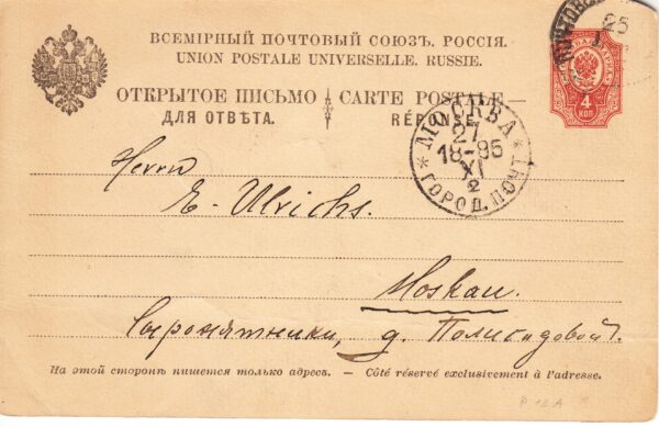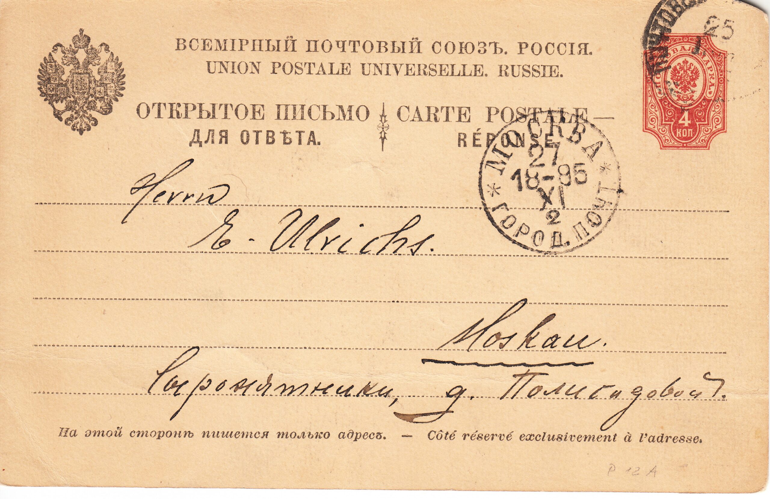 Маркированное открытое письмо № 11 (ответ) отправлено из Эйдткунена в Москву от 25.11.1895 г. В 1895 году Эйдткуненне входил в состав Российской империи. Цена по каталогу Крамаренко 2022 года $500.
