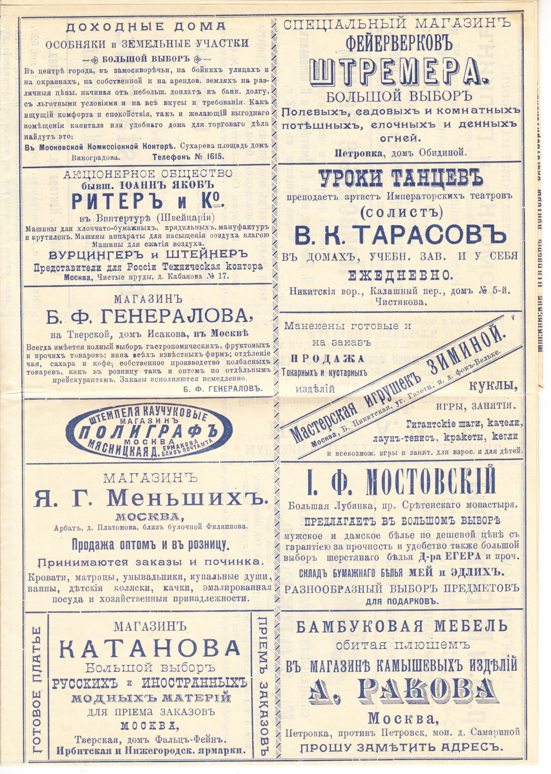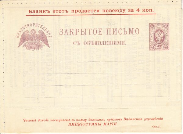 Благотворительные письма с объявлениями (БПО). С 7 октября 1898 по ноябрь 1901 года Ведомство детских приютов под покровительством Императрицы Марии Федоровны с разрешения Правительства Российской империи выпускало маркированные бланки благотворительных писем с объявлениями форматом около 430/440 : 297/307 мм. с клапанами для заклейки. На каждом бланке на адресной стороне в цвете кадра марки слева печатался символ благотво-рительности — пеликан, кормящий птенцов, сама марка справа и текст посередине в две строки: «ЗАКРЫТОЕ ПИСЬМО / сь объявленіями», а также красной краской тексты: вверху — «Бланкъ этоть продается повсюду за 4 (5) коп.», внизу — «Чистый доходь поступаеть вь пользу детских пріютовь Вдомства учрежденій ИМПЕРАТРИЦЫ МАРИ». Затем в частных типографиях печатались тексты и рисунки объявлений из разных городов Российской империи. Каждый выпуск имеет свой порядковый номер «серия Nº…, указанный в выходных данных типографии. Тираж каждого выпуска с маркой в 5 коп. — 3 000 экз.