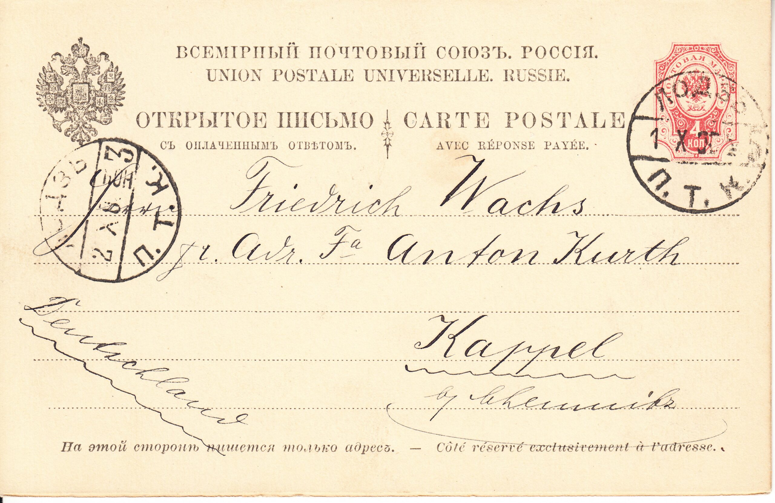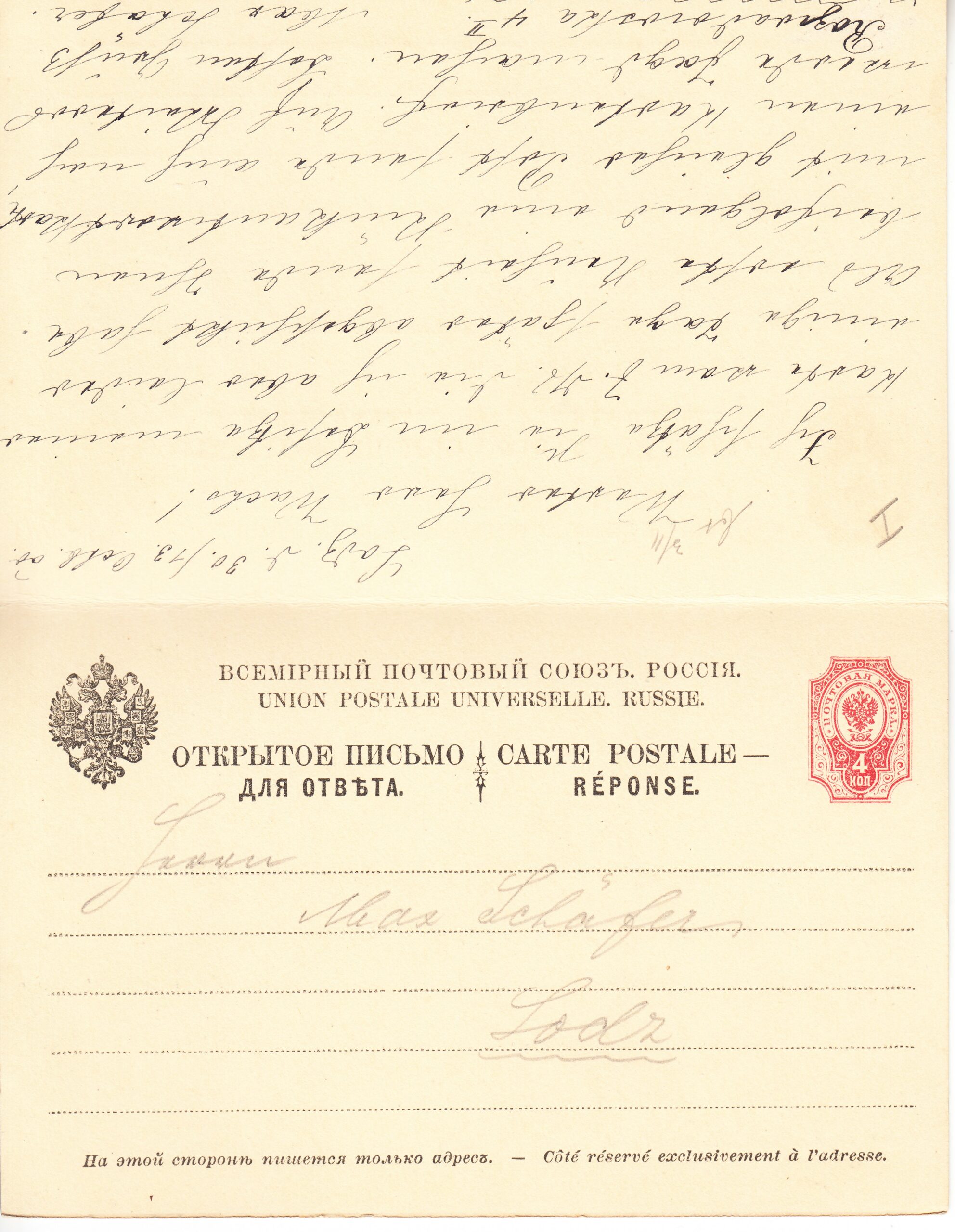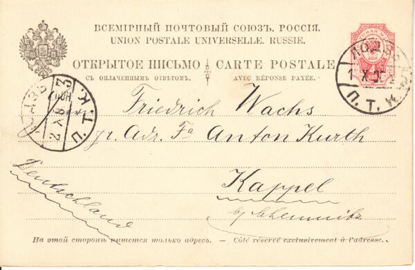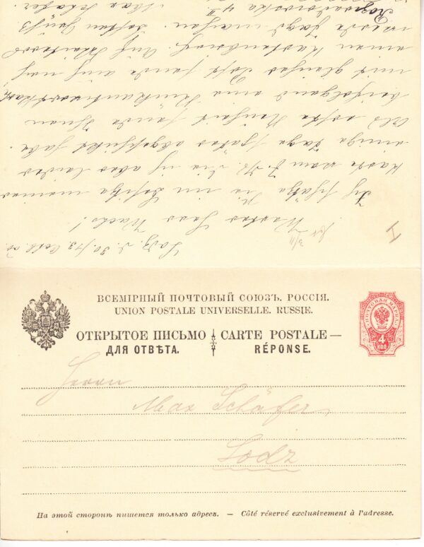 Маркированное открытое письмо № 11, с оплаченным ответом, отправлено из Лодзь в Каппель (Германия) от 01.10.1900 г. Цена по каталогу Крамаренко 2022 года $60.