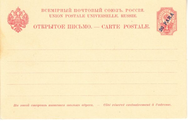 Открытое письмо. Русская почта за границей, Ближний Восток (Левант). Второй выпуск . «Пара и пиастра» № 3. Цена по каталогу Крамаренко 2022 года $35.