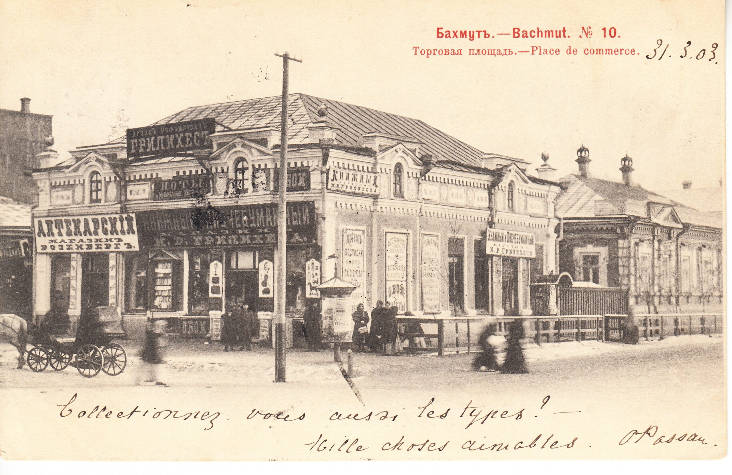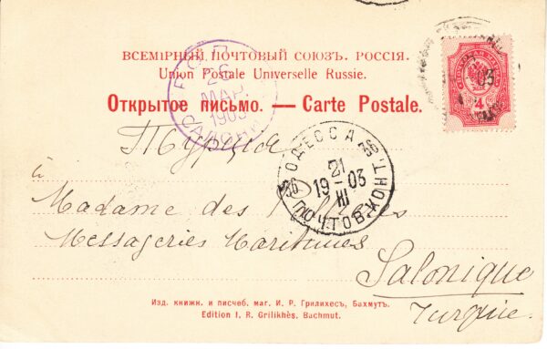 Открытое письмо отправлено из Одессы в Салоники от 21.03.1903 г. Письмо франкировано маркой 4 коп. № 84. Цена по каталогу Крамаренко 2022 года $15.