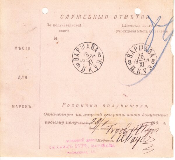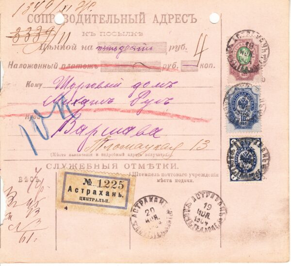 Сопроводительный адрес к посылке ценной на 50 рублей из Астрахани в Варшаву от 20.11.1904 г. Бланк франкирован 3-мя марками: 7 коп. № 74, 10 коп. № 85 и 50 коп. № 87. Цена по каталогу Крамаренко 2022 года $80.