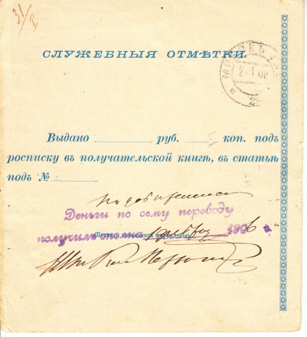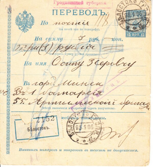 Перевод по почте на сумму 3 рубля из Белосток (Гродненская губерния) в Минск от 23.01.1906 года. Маркированный бланк с маркой 15 коп. № 6. Цена по каталогу Крамаренко 2022 года $60.