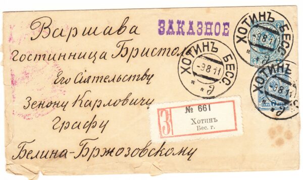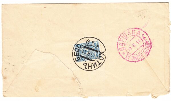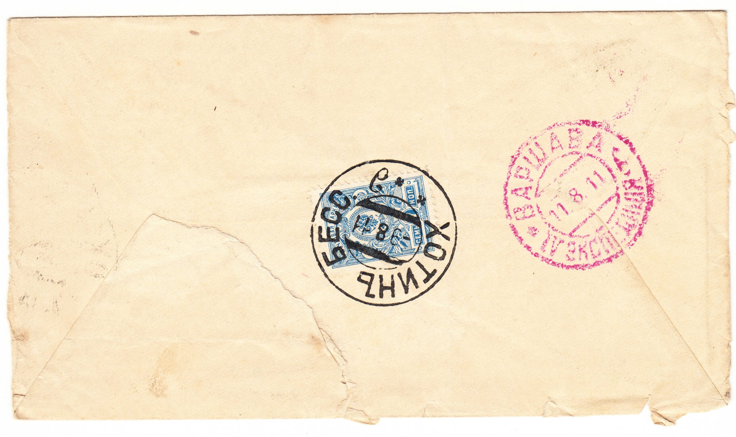 Маркированный конверт, прошедший почту. Семнадцатый выпуск №47С (143х81). Письмо дополнительно франкировано двумя марками 7 коп. №103-1 и отправлено из Хотин в Варшаву от09.08.1911 г. Цена по каталогу Крамаренко 2022 года $34,5.
