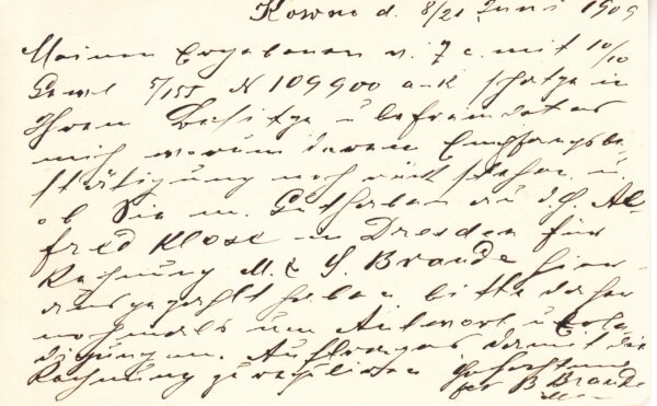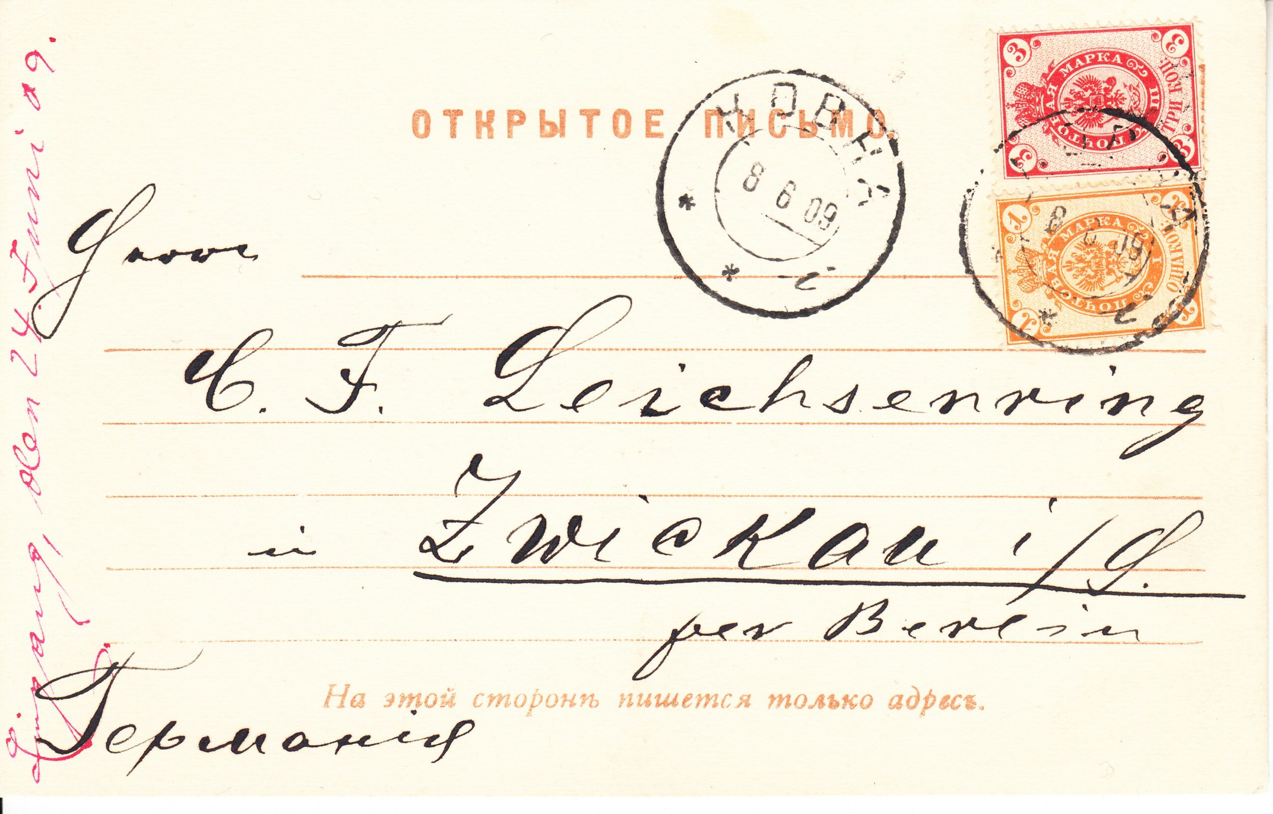 Открытое письмо отправлено из Ковна (Лифляндская губ. ныне Каунас) в Цвиккау (Германия) от 08.06.1909 г. Письмо франкировано 2-мя марками: 1 коп. №79 и 3 коп. № 81. Цена по каталогу Крамаренко 2022 года $55.