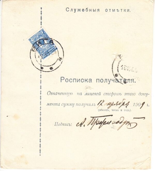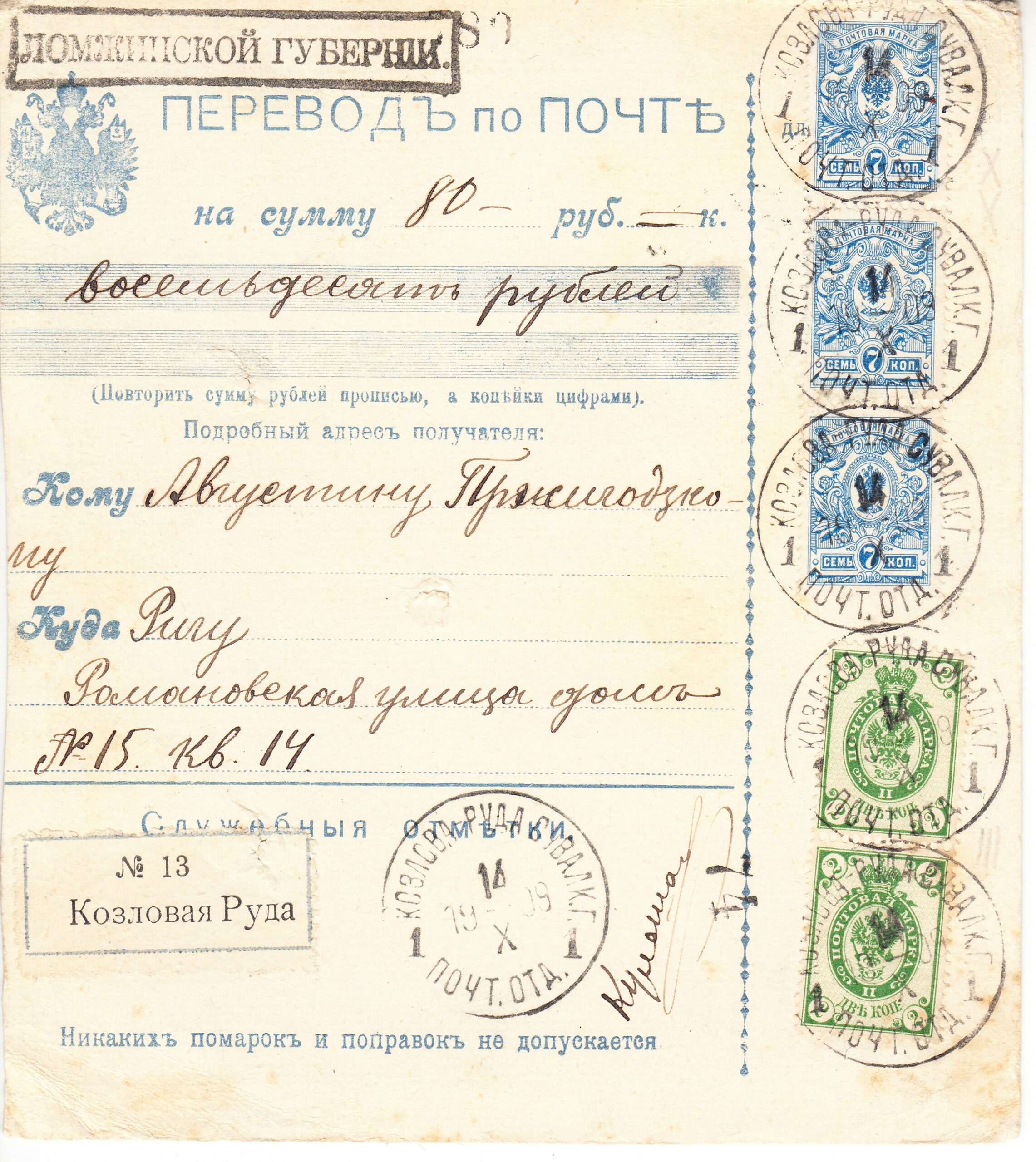 Перевод по почте на сумму 80 рублей из Козловая Руда в Ригу от 14.10.1909 года. Бланк  франкирован 6-ю марками: 2 коп. № 80 две штуки (сцепка), 7 коп. № 103 три штуки (сцепка) и 10 коп. № 104 одна штука. Цена по каталогу Крамаренко 2022 года $160,5.