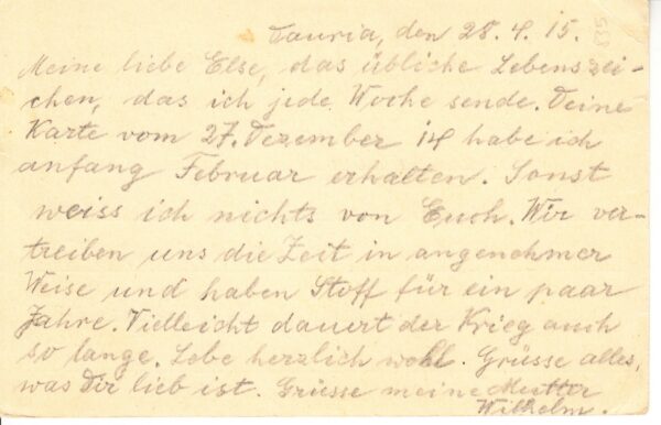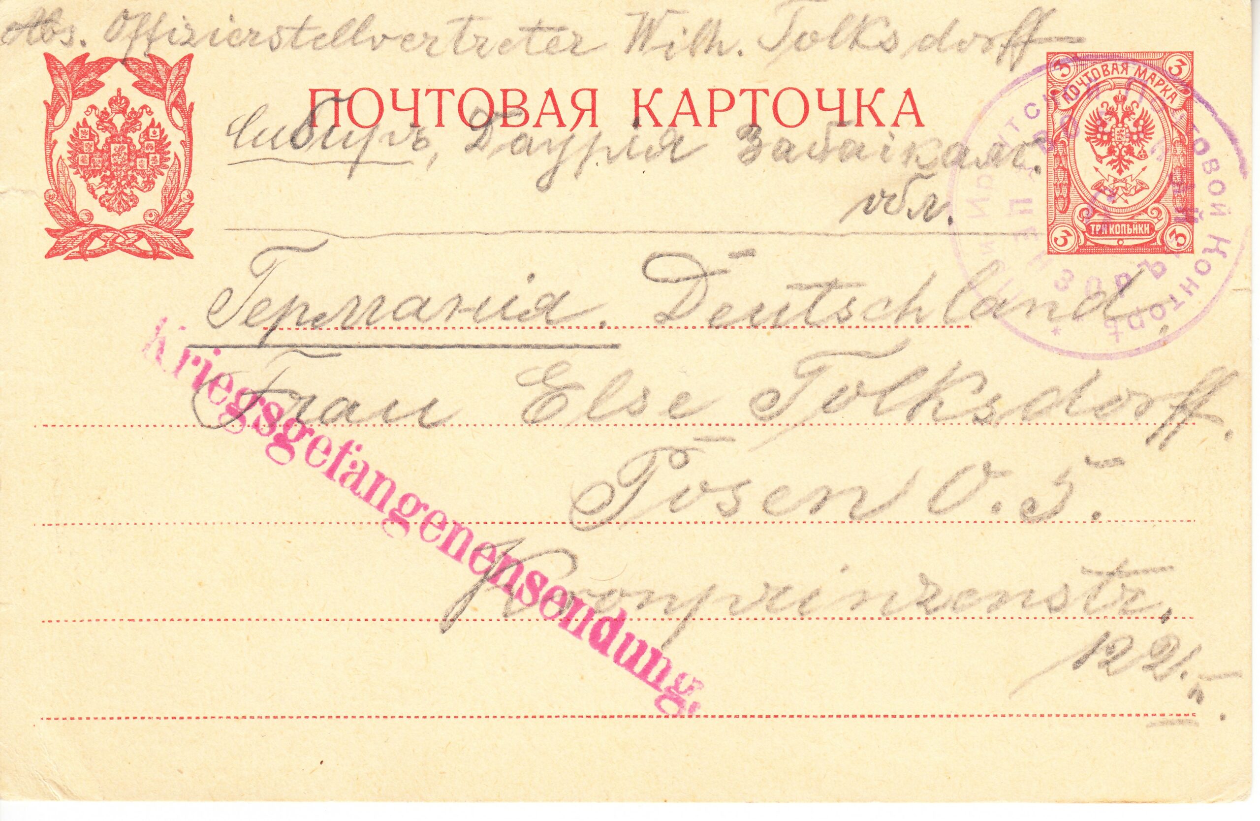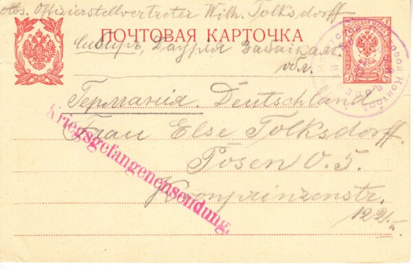 Почтовая карточка девятого выпуска № 20, прошедшая почту из Забайкальской области в Германию. Марка погашена штемпелем «Военный цензор при Иркутской почтовой конторе». Цена по катологу Крамаренко $6.5