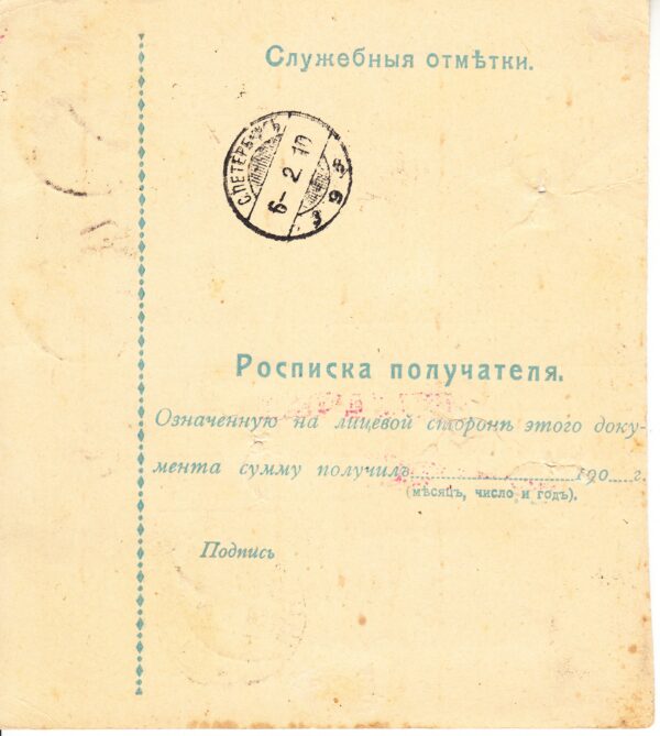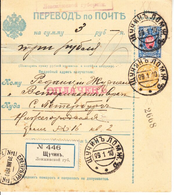 Перевод по почте на сумму 3 рубля из Щучин в С.Петербург от 29.01.1910 года. Бланк франкирован 2-мя марками: 1 коп. № 98 и 14 коп. № 105. Цена по каталогу Крамаренко 2022 года $130.