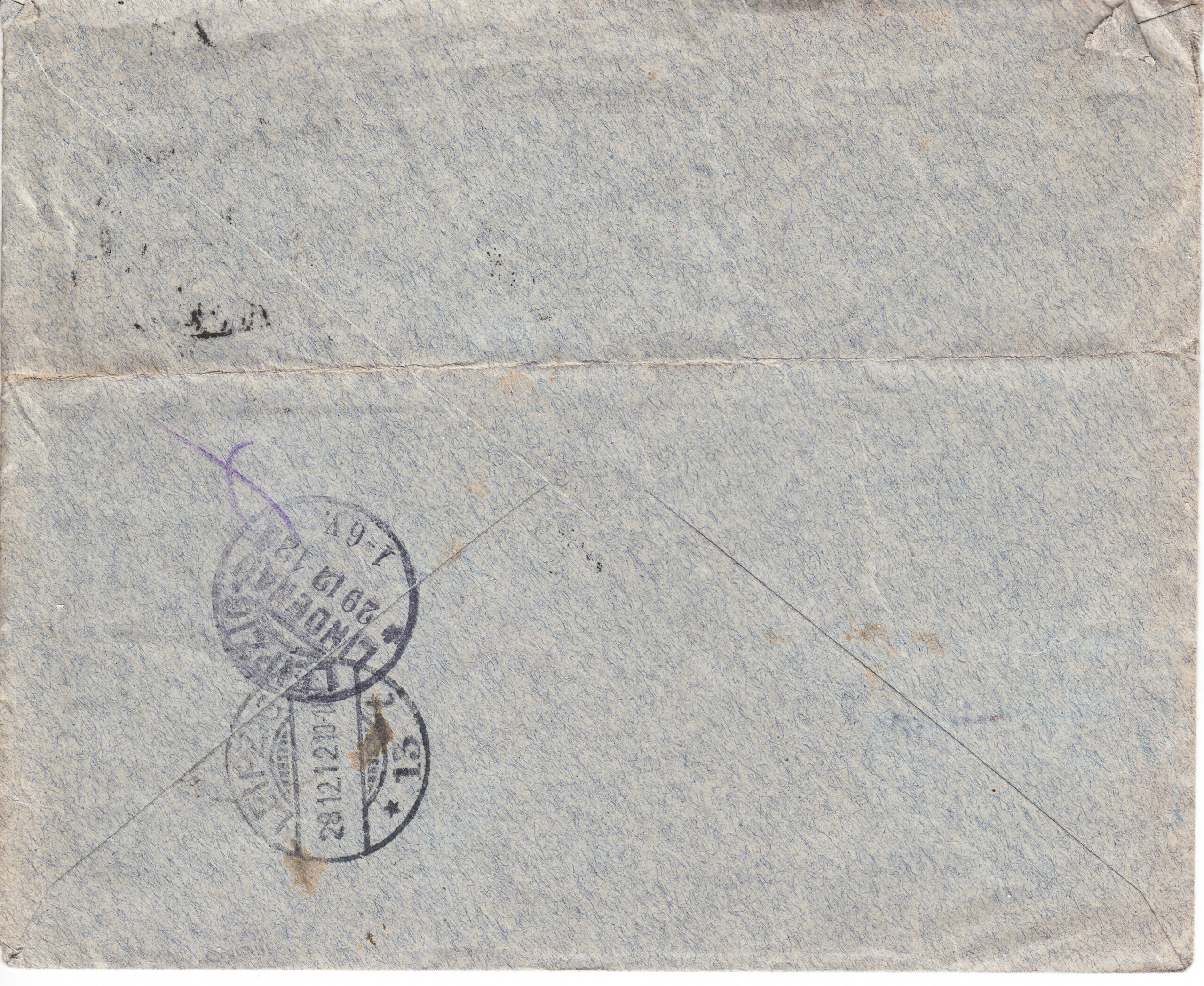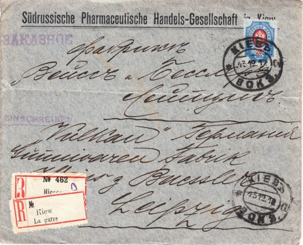 Заказное письмо из Киева в Лейпциг (Германия) от 13.12.1912 г. Фирменный конверт франкирован маркой 20 коп. № 107 первый выпуск. Цена по каталогу Крамаренко 2022 года $75.