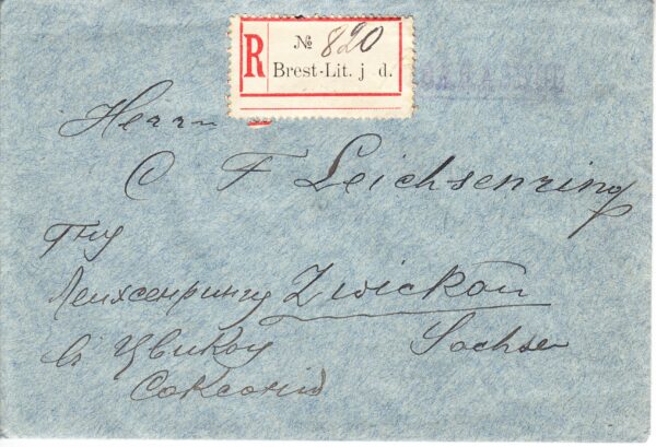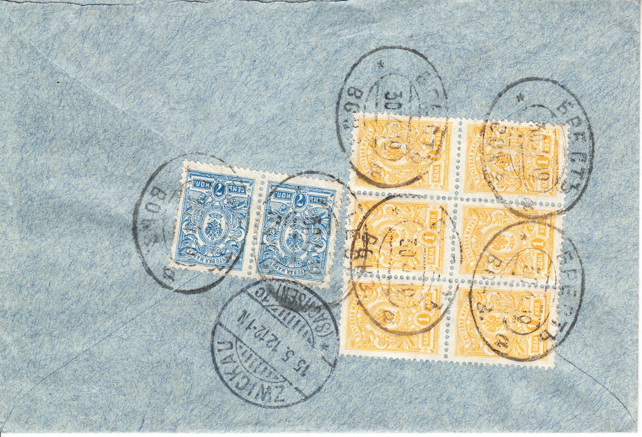 Заказное письмо из Брест-Литовска в Цвикау (Германия) от 30.04.1912 года. Конверт франкирован 8-ю марками: 1 коп. № 98 шестиблок (первый выпуск) и 7 коп. № 103 две марки сцепка (первый выпуск). Цена по каталогу Крамаренко 2022 года $527.
