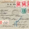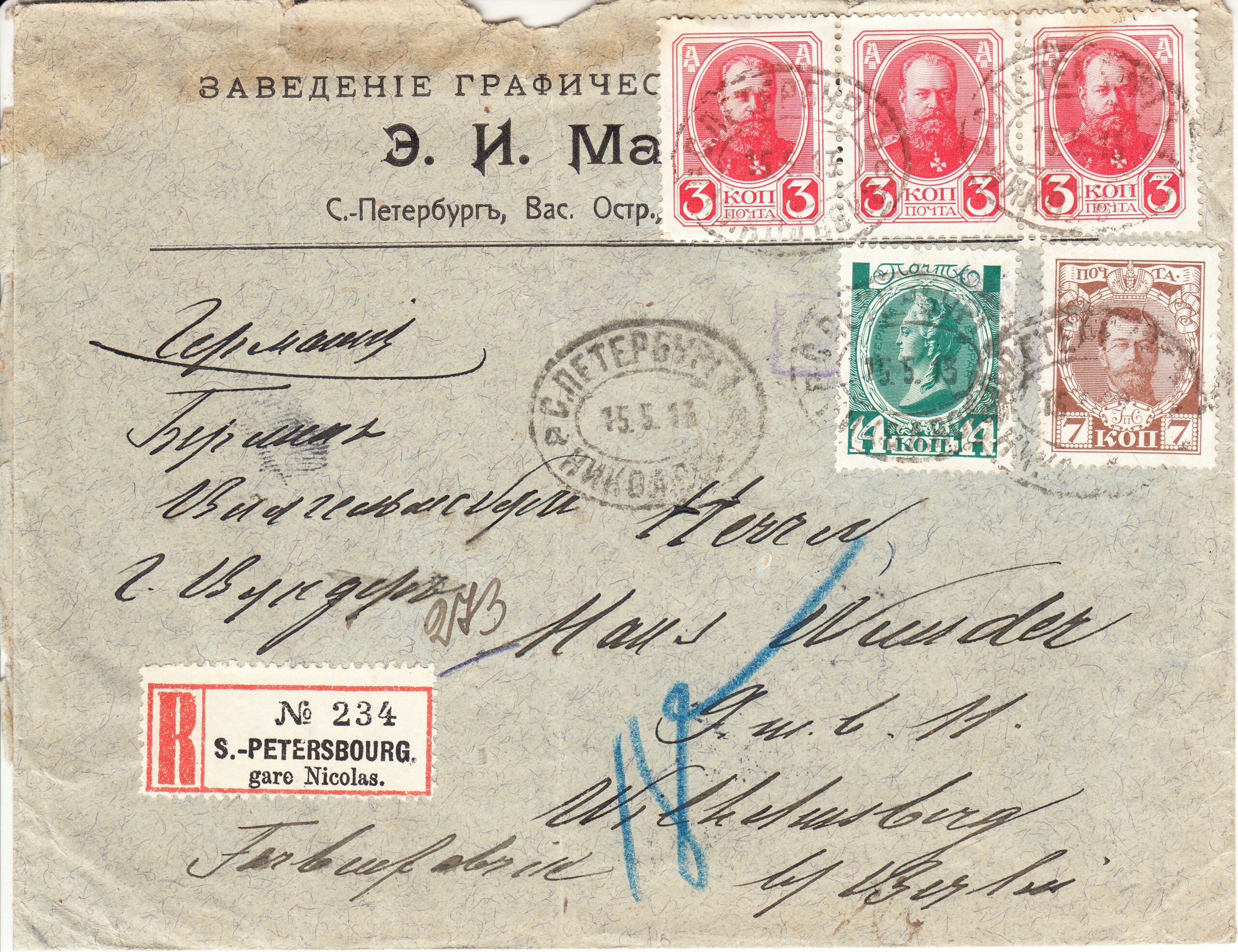 Заказное письмо из С.Петербурга в Берлин от 15.05.1913 г. Фирменный конверт «заведение графических искусств Э.И. Маркуса» франкирован 5-ю марками: 3 коп. № 115 три штуки, 7 коп. № 117 одна штука и 14 коп. № 119 одна штука. Цена по каталогу Крамаренко 2022 года $55.
