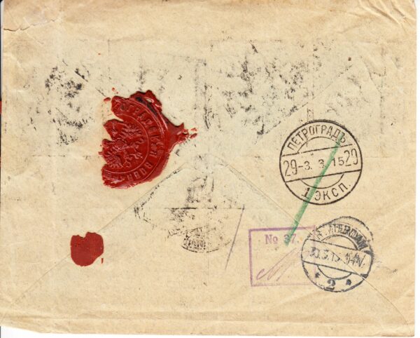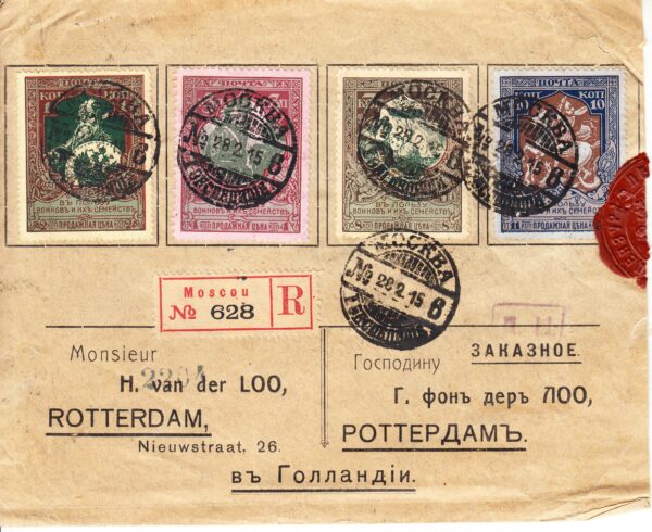 Заказное письмо из Москвы в Роттердам (Голландия) через Петроград от 28.02.1915 г. Фирменный конверт франкирован 4-мя марками почтово-благотворительного выпуска: 1 (2) коп. № 130С, 3 (4) коп. № 131А, 7 (8) коп. № 132А и 10 (11) коп. № 133А. На обратной стороне сургучная печать «петроградской военной цензуры». Цена по каталогу Крамаренко 2022 года $235.
