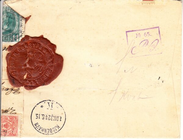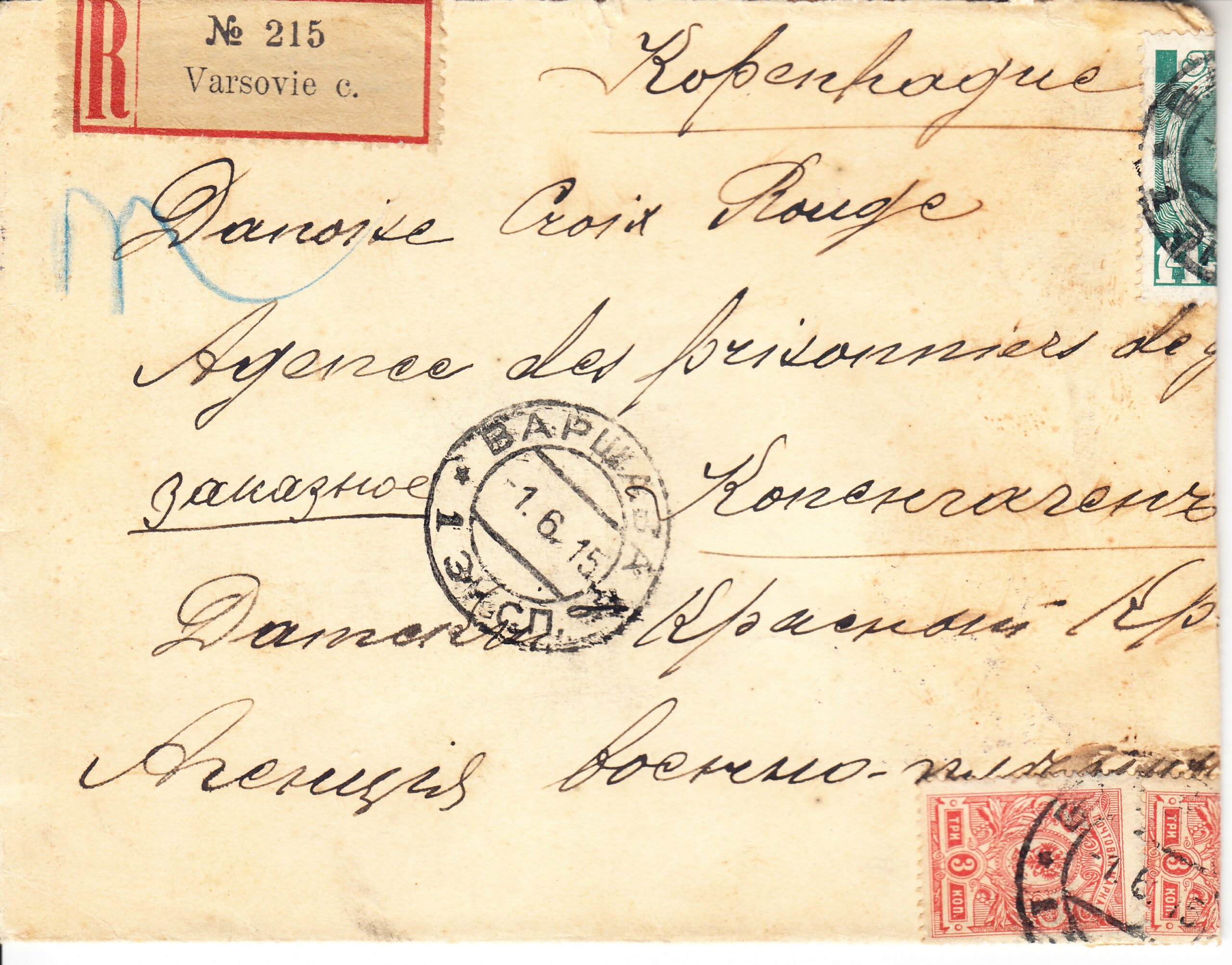 Заказное письмо из Варшавы в Kjobenhavn (Дания) от 01.06.1915 г. Конверт франкирован 3-мя марками: 3 коп. № 100 две штуки (второй выпуск), 14 коп. № 119. На обратной стороне сургучная печать «петроградская военная цензура». Цена по каталогу Крамаренко 2022 года $35.
