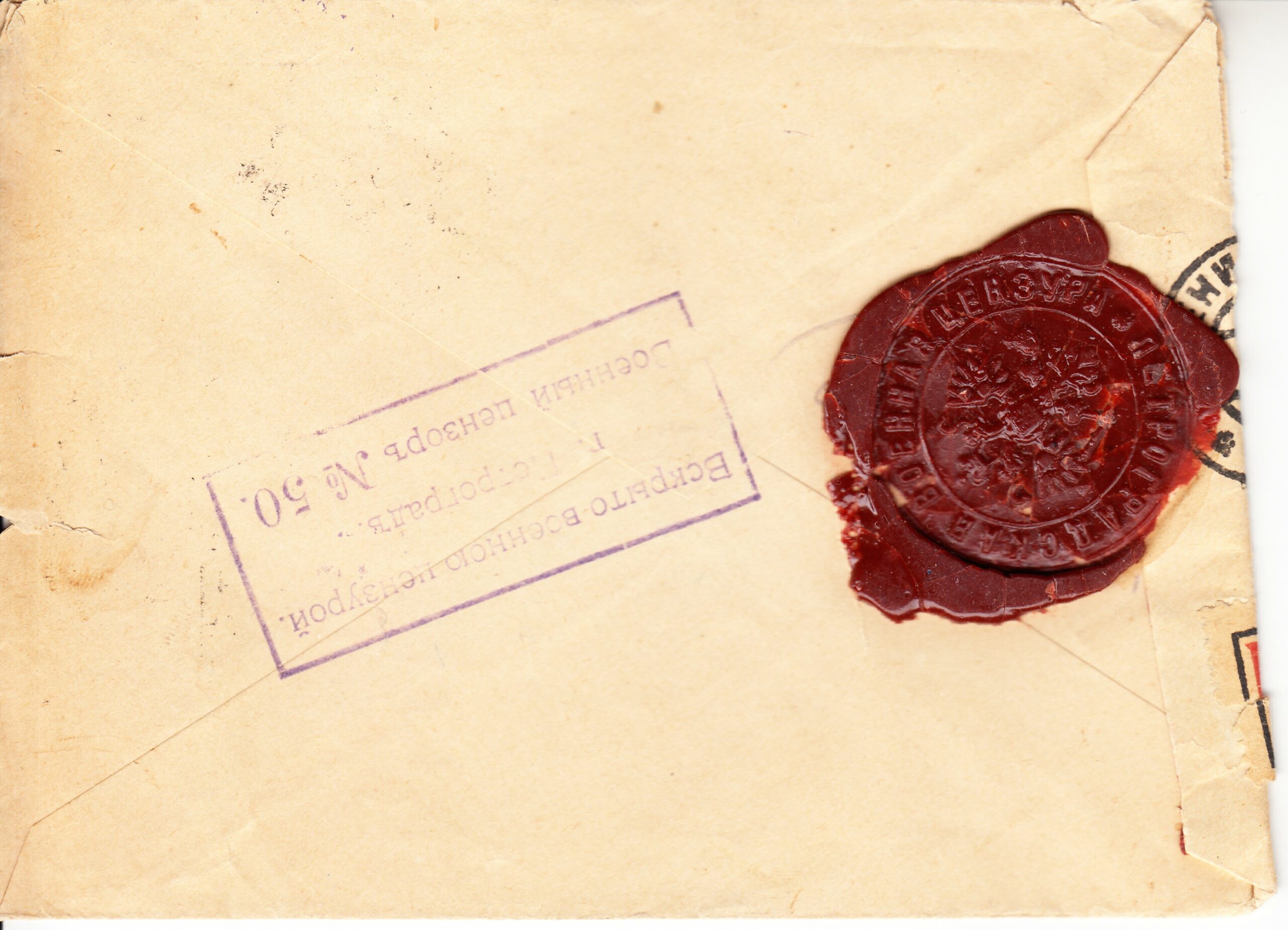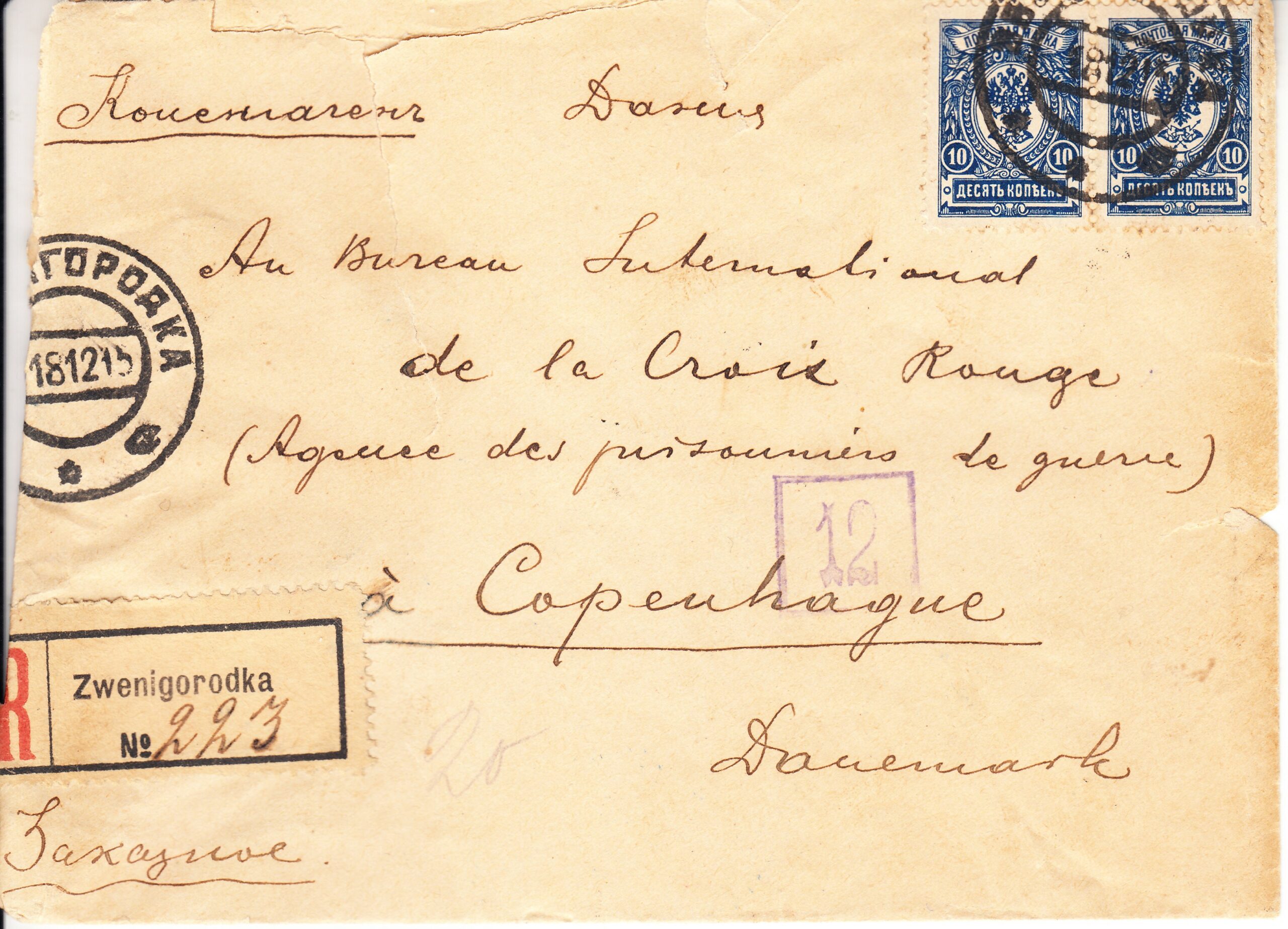 Заказное почтовое отправление из Звенигородки в Копенгаген (Дания) от 18.12.1915 г. Письмо франкировано парой марок 10 коп. № 104 выпуска 1912 года, погашенных штемпелем «Звенигородка». На лицевой стороне ярлык заказного письма «R / Zwenigorodka №223» и штемпель «12». На оборотной стороне штамп «Вскрыто военною цензурой. г. Петроградъ. Военный цензоръ № 50.» и сургучная печать с двуглавым орлом «Петроградская Военная Цензура».
