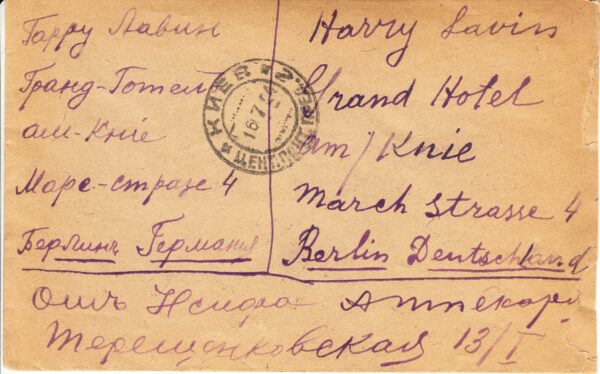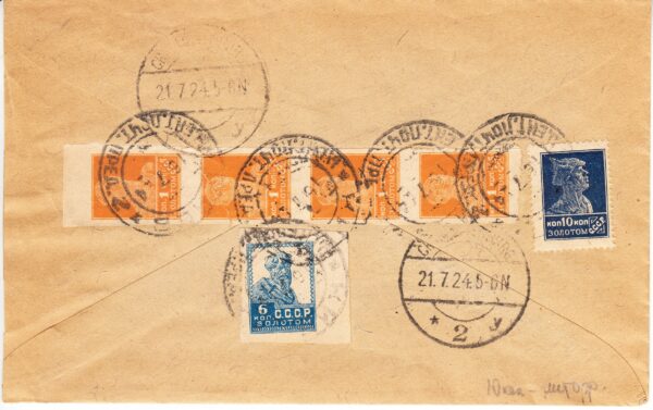 Письмо было отправлено из Киева в Берлин от 16.07.1924 г. Конверт франкирован 6-ю марками: 1 коп. № 117 четыре марки (сцепка), 6 коп. № 122 одна марка и 10 коп. № 123 одна марка. Цена по каталогу Ляпина 2010 года 33 евро.