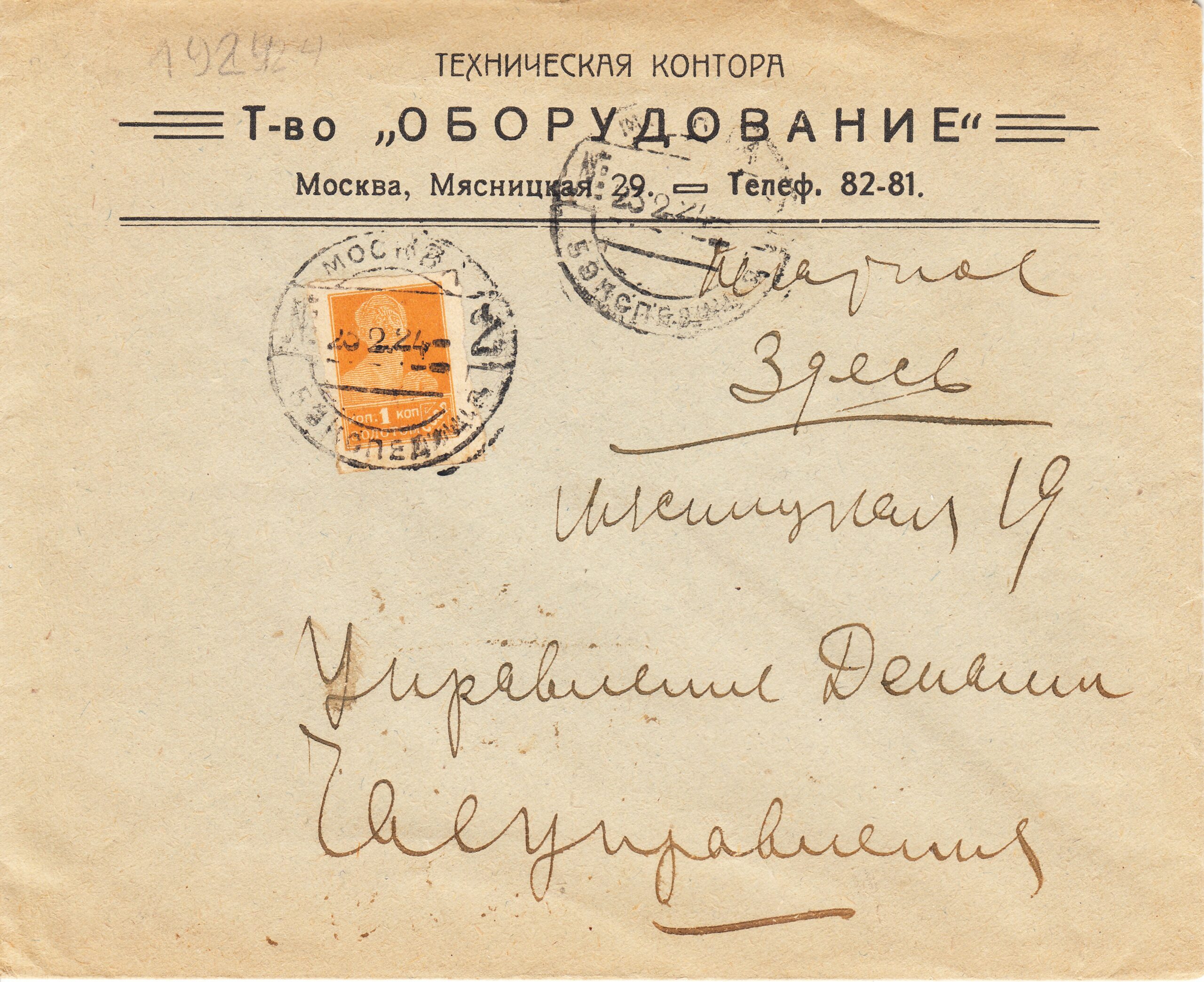 Письмо на фирменном конверте было отправлено по Москве (местное) от 23.02.1924 г. Конверт франкирован маркой 1 коп. № 117. Цена по каталогу Ляпина 2010 года 5 евро.