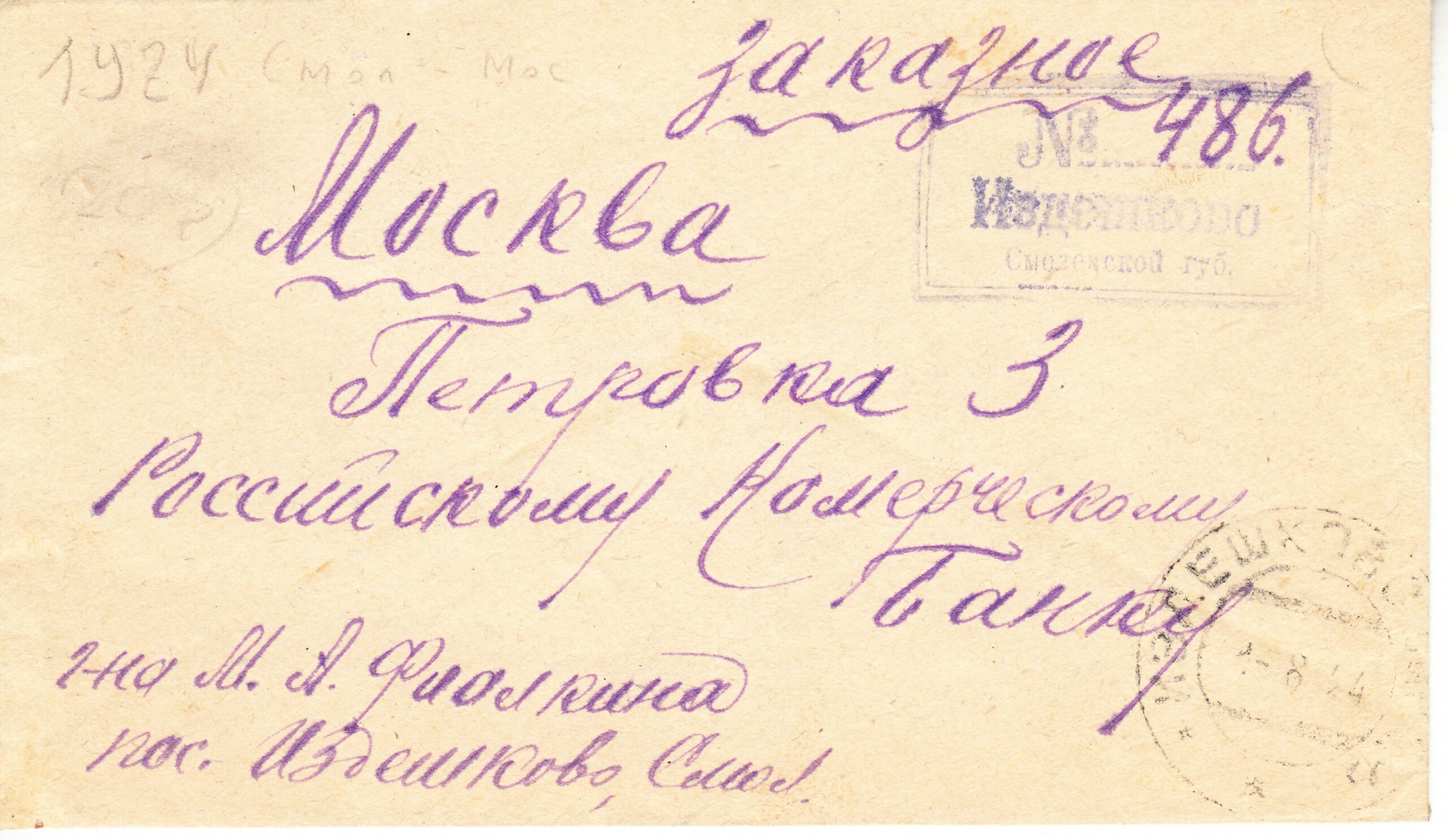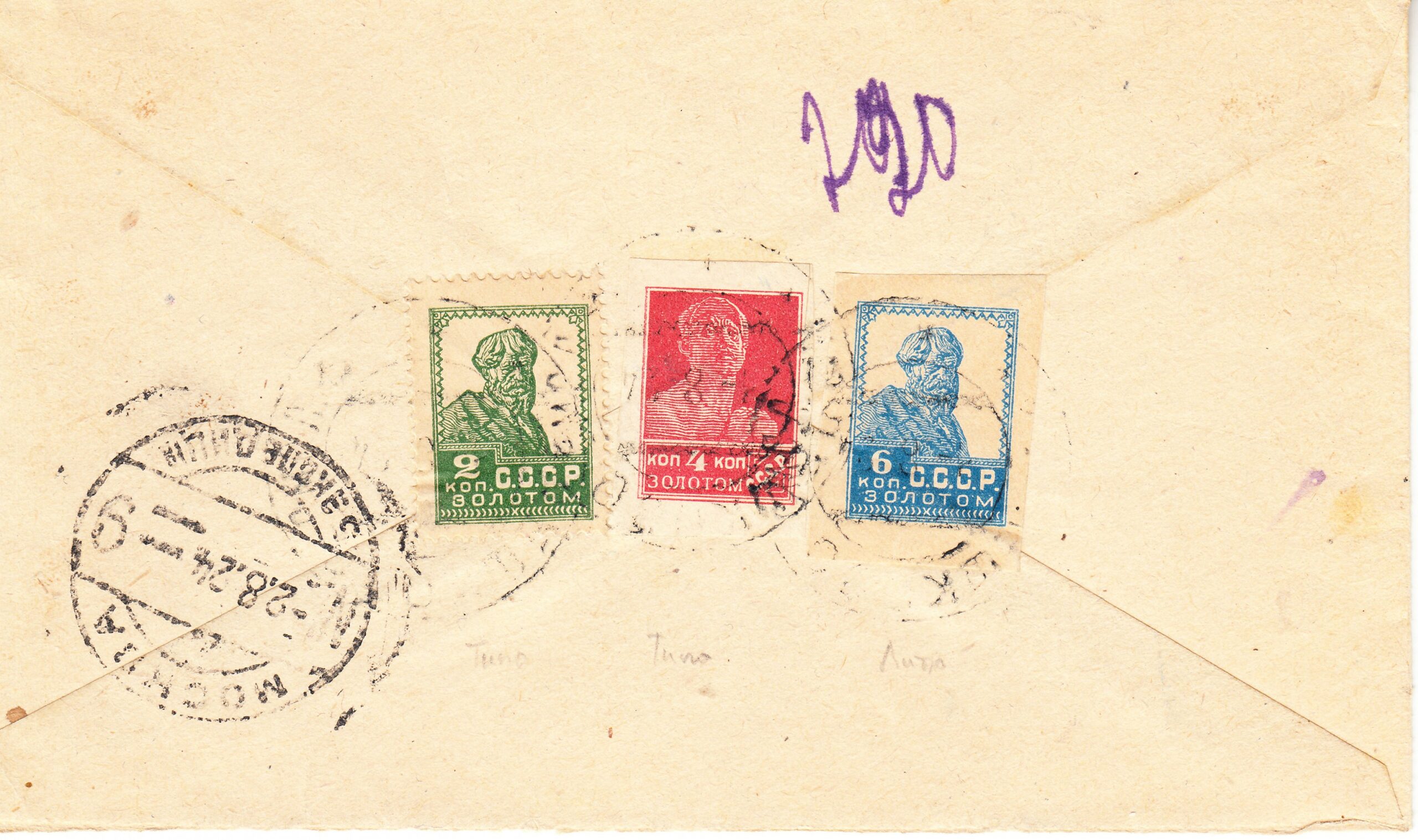 Заказное письмо было отправлено из Издешково (Смоленская губ.) в Москву от 01.08.1924 г. Конверт франкирован 3-мя марками: 2 коп. № 140, 4 коп. № 120 и 6 коп. № 122. Цена по каталогу Ляпина 2010 года 14 евро.