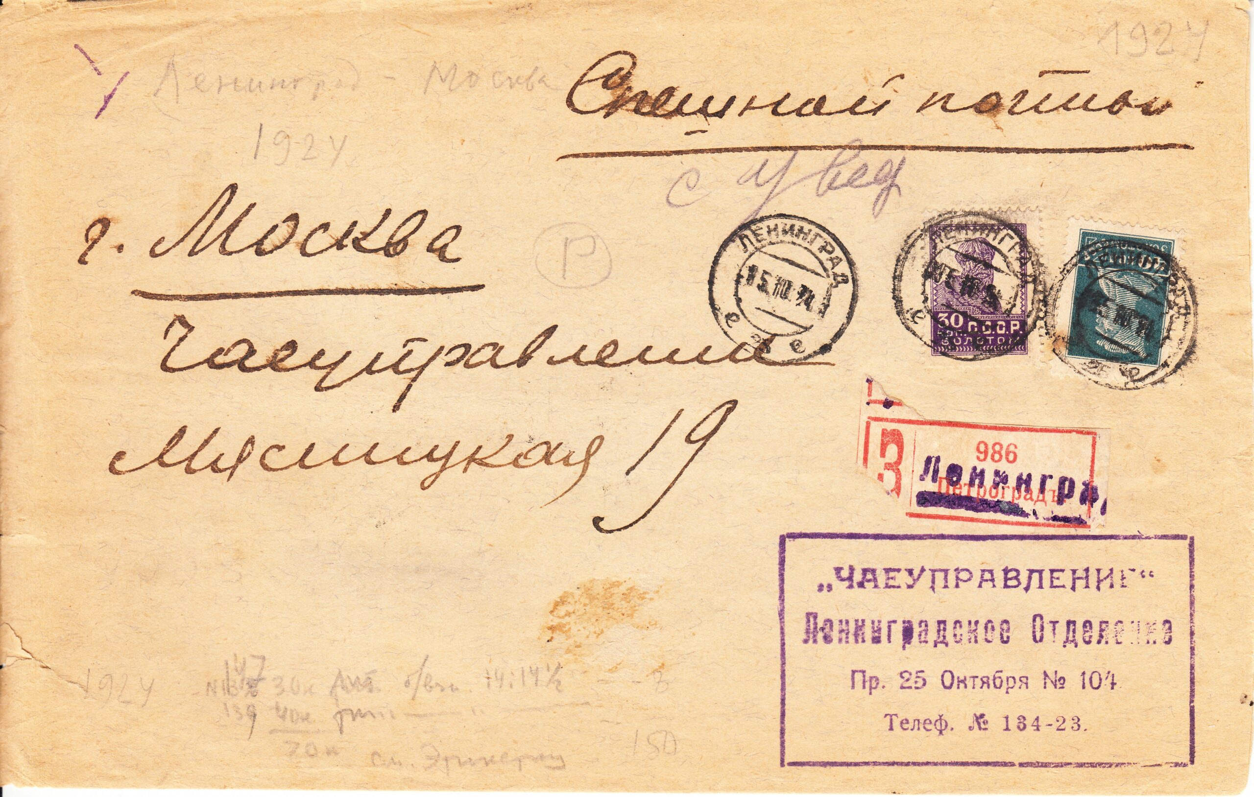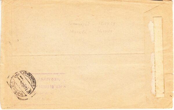 Письмо спешной почты было отправлено из Ленинграда в Москву от 15.10.1924 г. Конверт франкирован 2-мя марками: 30 ккоп. № 152 и 40 коп. № 153. Цена по каталогу Ляпина 2010 года 16 евро.
