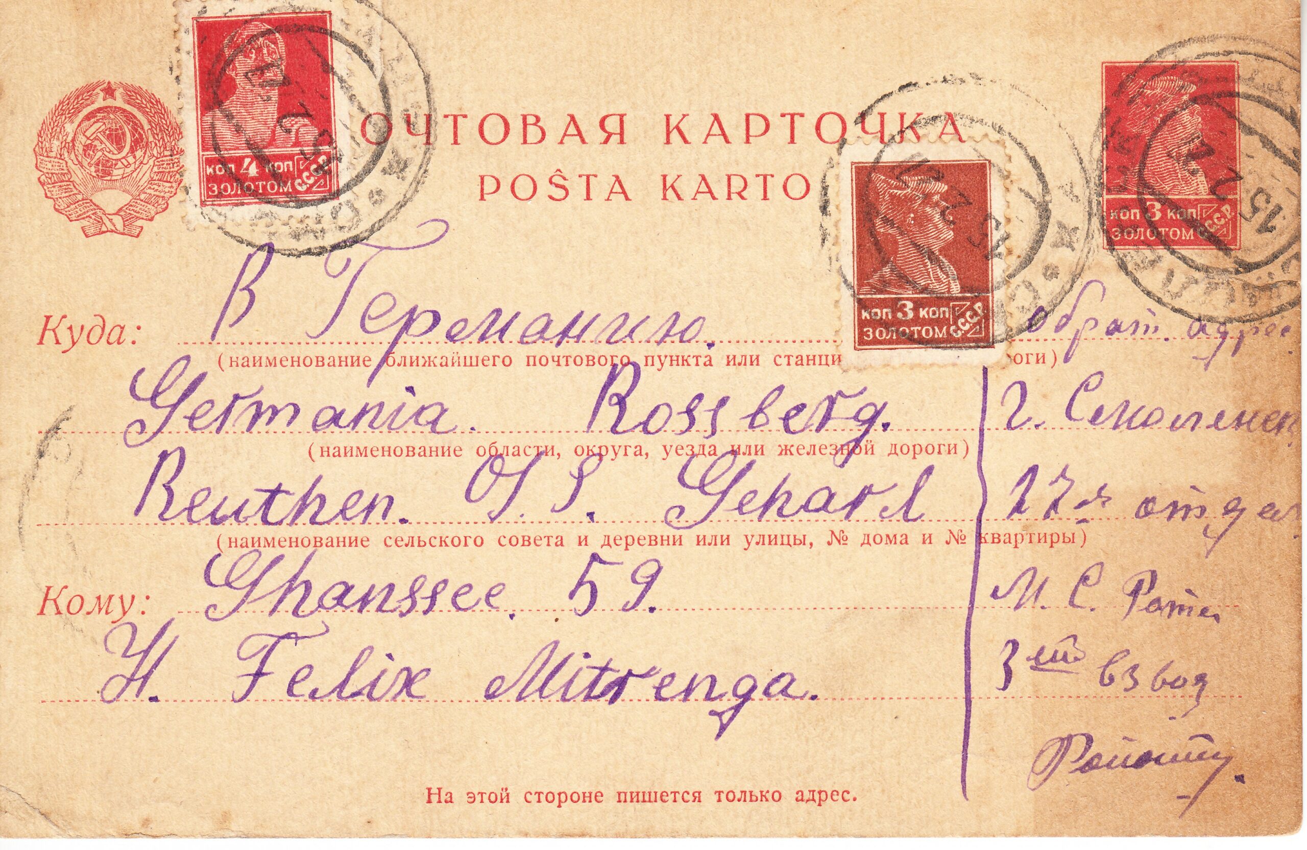 Маркированная почтовая карточка с маркой 3 коп. золотом, дополнительно франкирована 2-мя марками: 3 коп. золотом № 172 и 4 коп. золотом № 173. Карточка прошла почту из Смоленска в Росберг (Германия) от 15.02.1927 года.