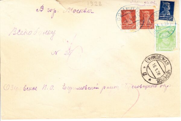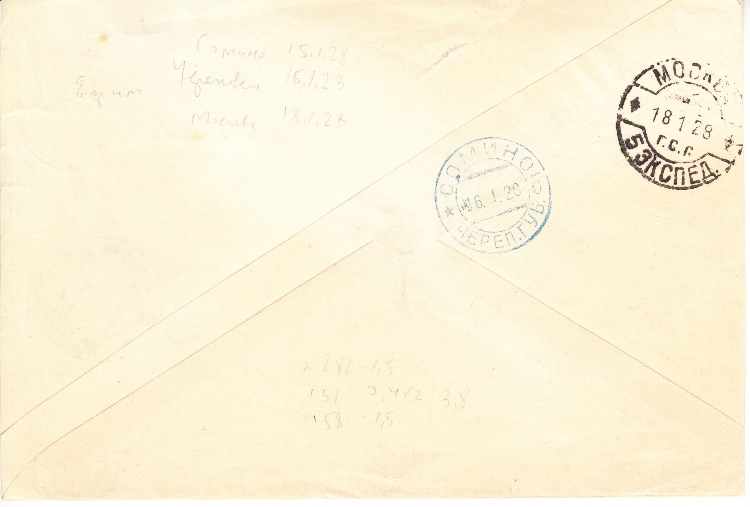 Заказное письмо было отправлено из Сомино (Череповецкая губ.) в Москву от 15.01.1928 г. Конверт франкирован 4-мя марками: 2 коп. № 258 одна марка, 3 коп. № 172 две марки (сцепка) и 10 коп. № 179 одна марка. Цена по каталогу Ляпина 2010 года 59 евро.