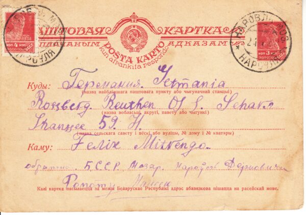 Маркированная почтовая карточка с маркой 3 коп. золотом, дополнительно франкирована маркой 4 коп. золотом № 173. Карточка прошла почту из Наровль (Белоруссия) в Росберг (Германия) от 24.01.1929 года.