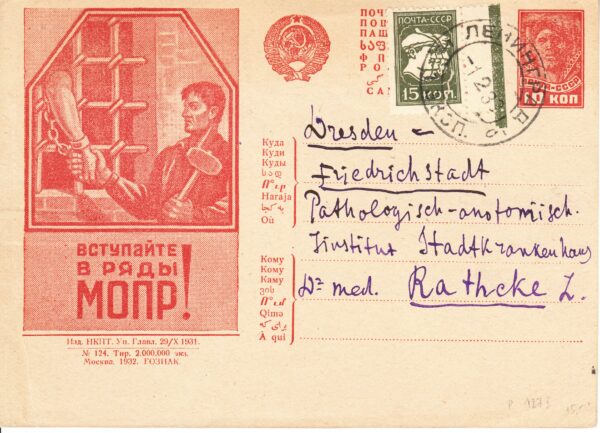 Маркированная почтовая карточка, прошедшая почту из Ленинграда в Дрезден (ГДР) от 01.02.1933 года. Карточка дополнительно франкирована маркой 15 коп. № 301.