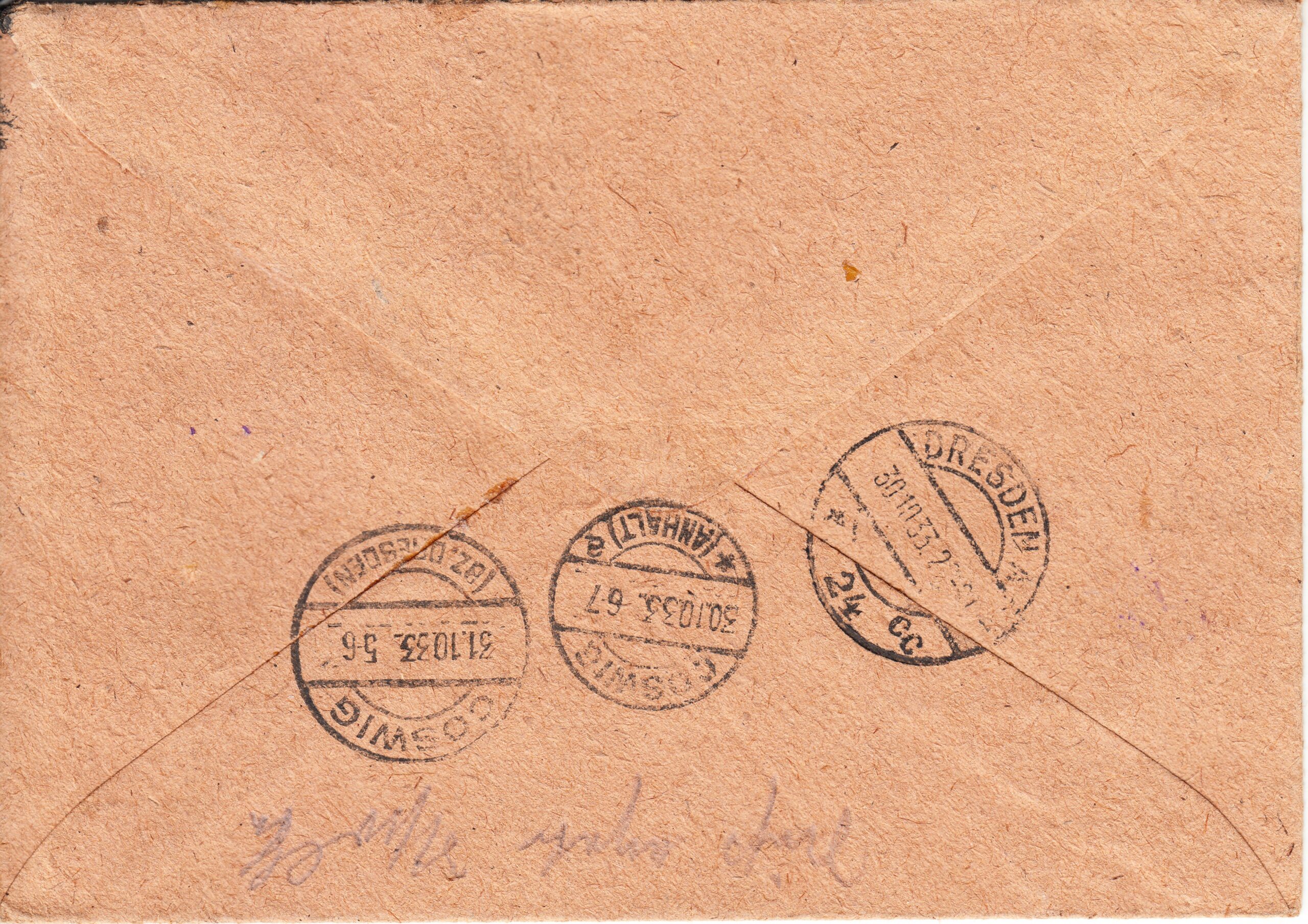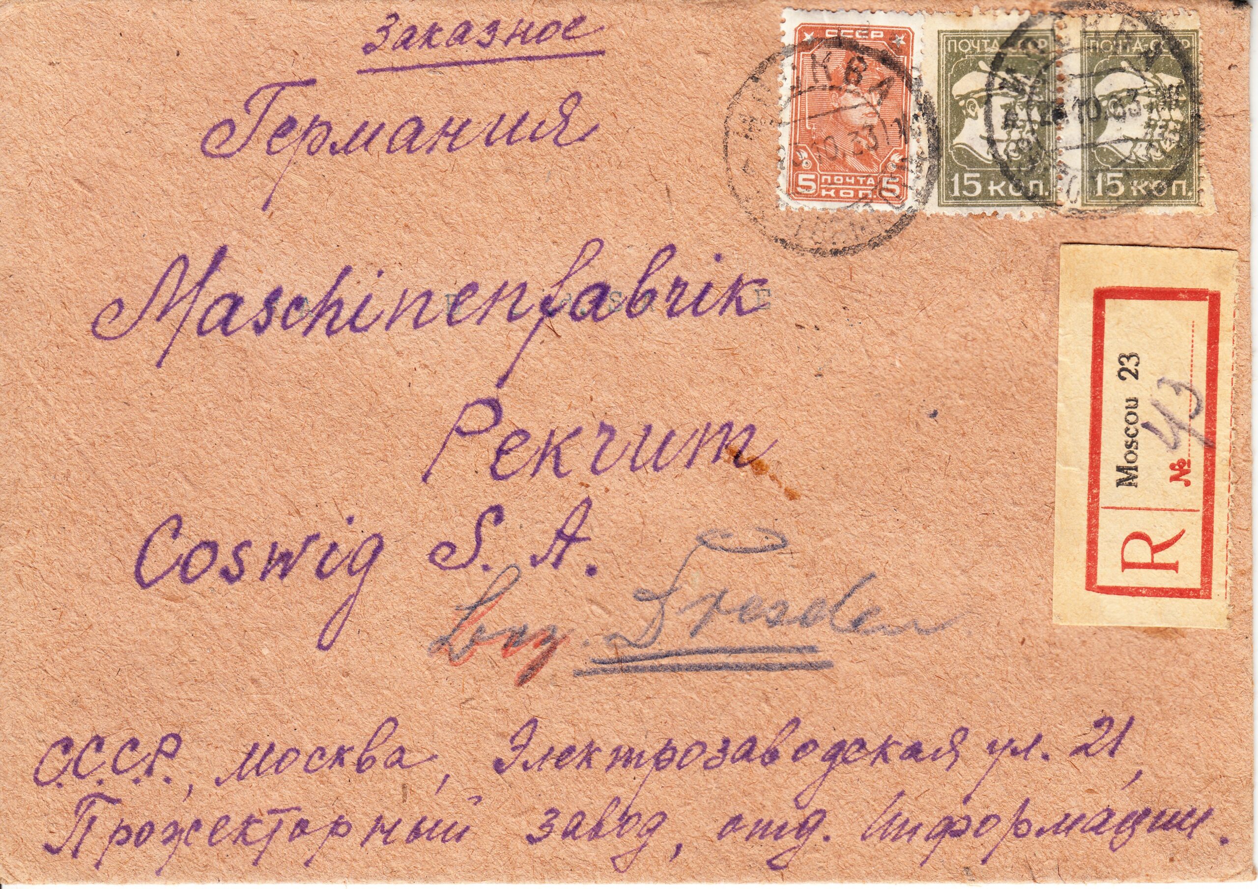 Заказное письмо отправлено из Москвы в Косвиг (Германия) от 23.10.1933 г. Конверт франкирован 3-мя марками: 5 коп. № 297 одна марка и 15 коп. № 301 две марки (сцепка). Цена по каталогу Ляпина 2010 года 18 евро.