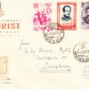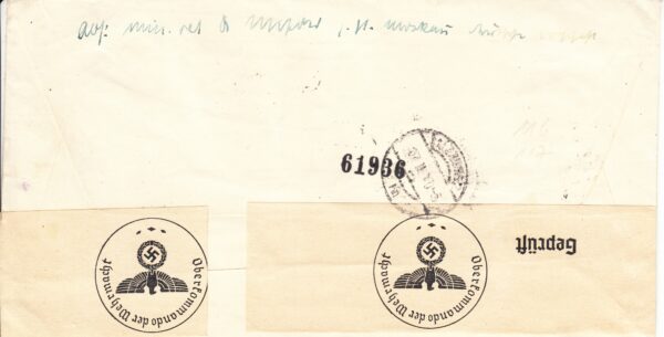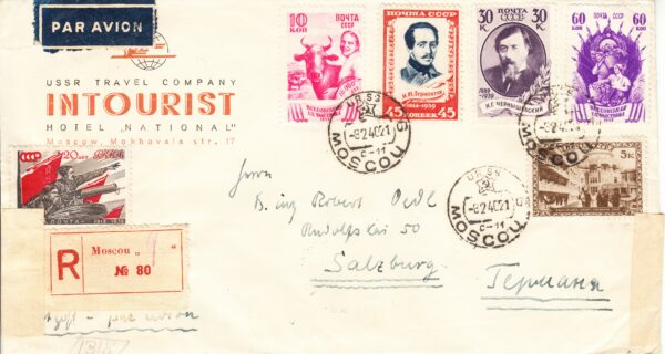 Заказное письмо отправлено из Москвы в Зальцбург (Германия) 08.02.1940 года. Фирменный конверт франкирован 6-ю марками: 5 коп. № 669, 10 коп. № 644, 30 коп. № 681, 45 коп. № 679, 60 коп. № 651 и 1 руб. № 552А. Письмо отправлено авиа-почтой. Цена по каталогу Лапина 2010 года 52 евро.