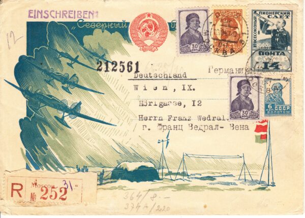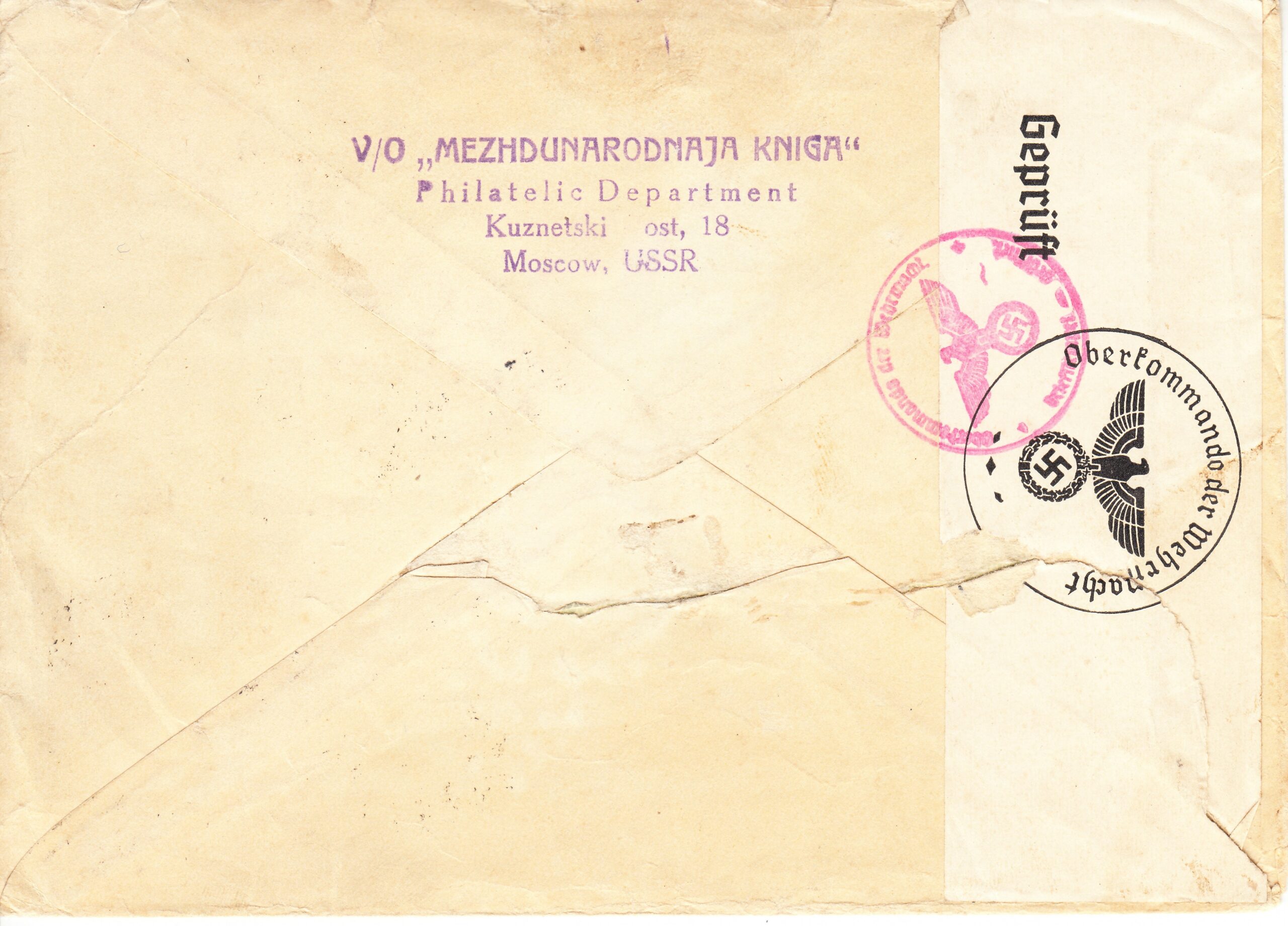Заказное письмо из Москвы в Вену от 10.10.1940 года. Конверт франкирован 5-ю марками: 6 коп. № 175 одна марка, 14 коп. № 292 одна марка, 30 коп. № 303 две марки и 80 коп. № 306 одна марка. Цена по каталогу Лапина 2010 года 85 евро.
