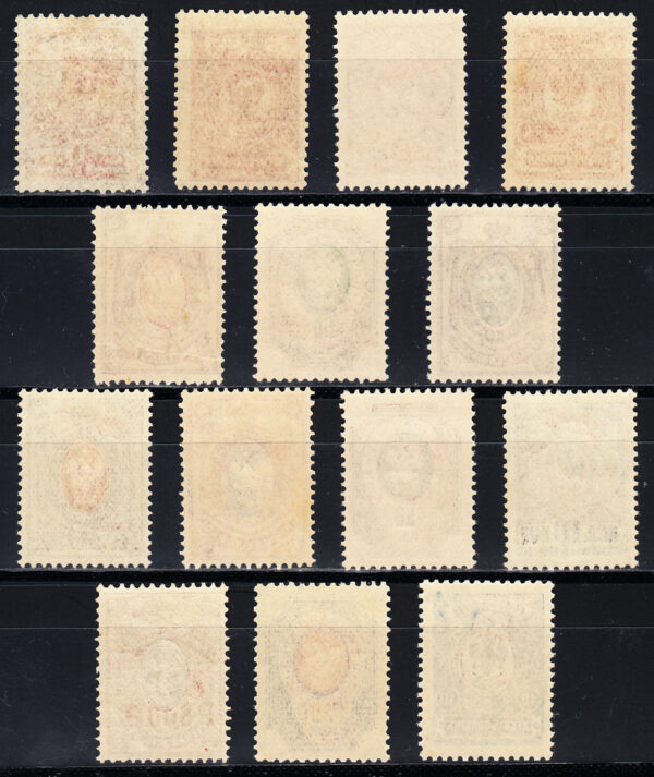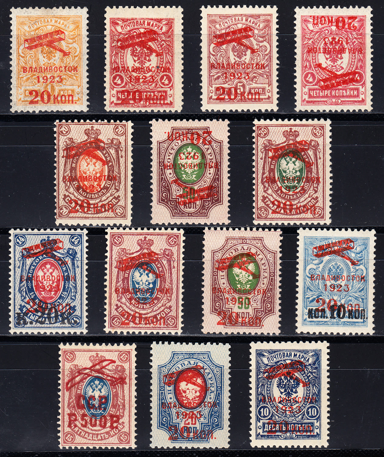 Литографская надпечатка красного цвета «самолёт» на марках Российской Империи.