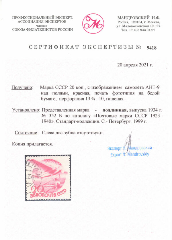 Марка с гашением на бумаге без водяного знака. Не каталогизирована! Сертификат Н.Ф. Мандровского.